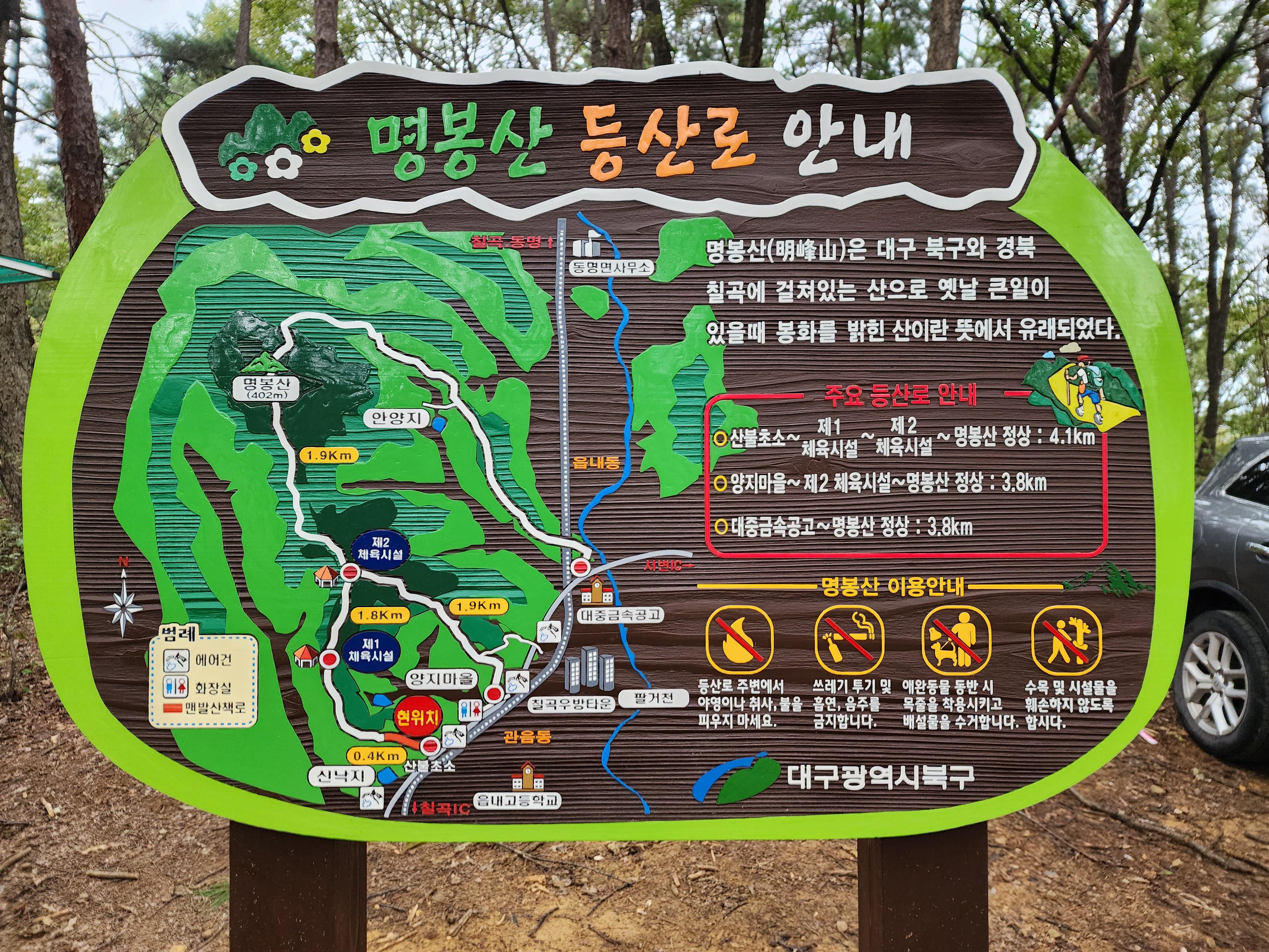 ① 자동차로 가는 분들은 내비게이션에서 <북구 관음로 179-30>을 검색해서 가길 바란다. 또는 북구 <양지마을 토담집 053-312-3995>을 검색해서 가면 바로 공터의 공영주차장이 있다. 그곳에 주차하고 300m 정도 올라가면 명봉산 입구에 10여 대 주차할 수 있는 공터가 있다. 평일 아침에는 이곳에 주차할 수 있지만 주말에는 밑에 있는 공용주차장에 주차하고 가길 바란다. 이곳 입구는 찾기가 좀 어렵다. 그래서 내비에서 위의 주소를 검색해서 가길 바란다. 칠곡 IC에서 동명 쪽으로 500m 정도 가다가 우측으로 굴다리를 통과하여 들어가면 된다. 물론 주차료는 없다.