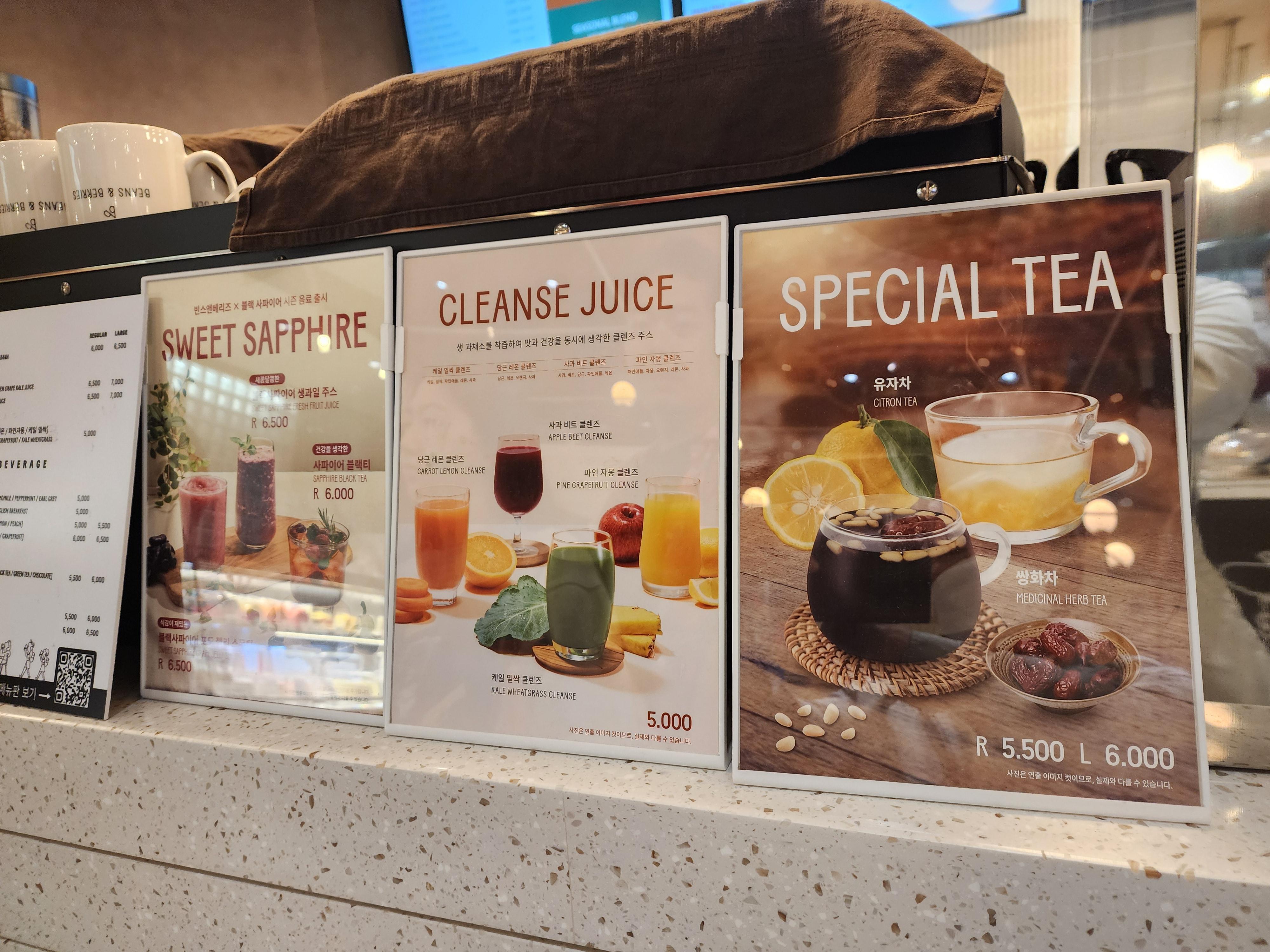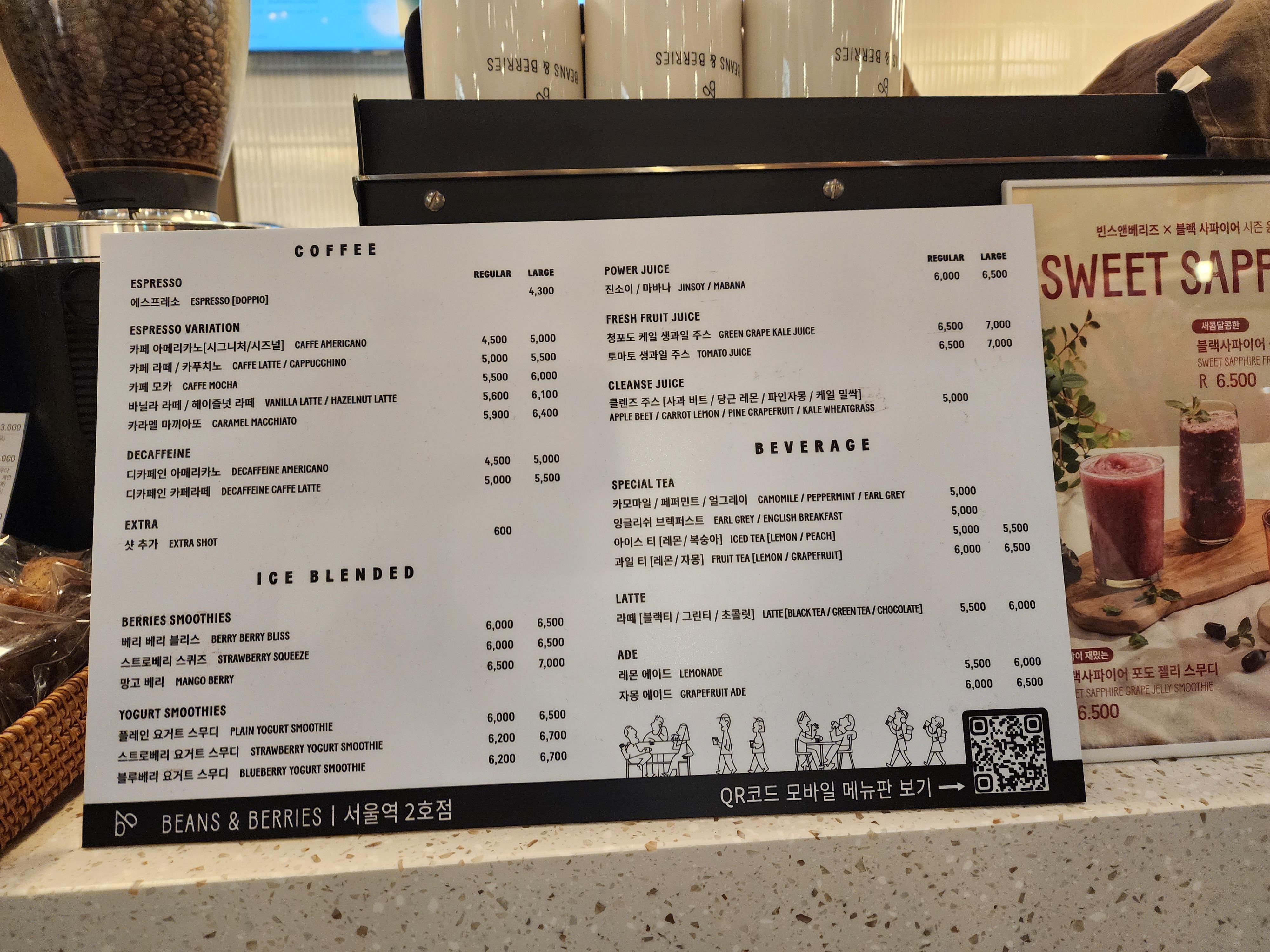 ▣ 메뉴; 에스프레소 4.3천 원, 아메리카노 4.5천 원, 카페 라테/ 카푸치노 5천 원, 바닐라라테, 5.6천 원, 베리베리 블리스 6천 원, 스토리베리 스쿼즈 6천원, 망고 베리 6.5천 원, 블랙 사파이어 생과일주스 6.5천 원 등