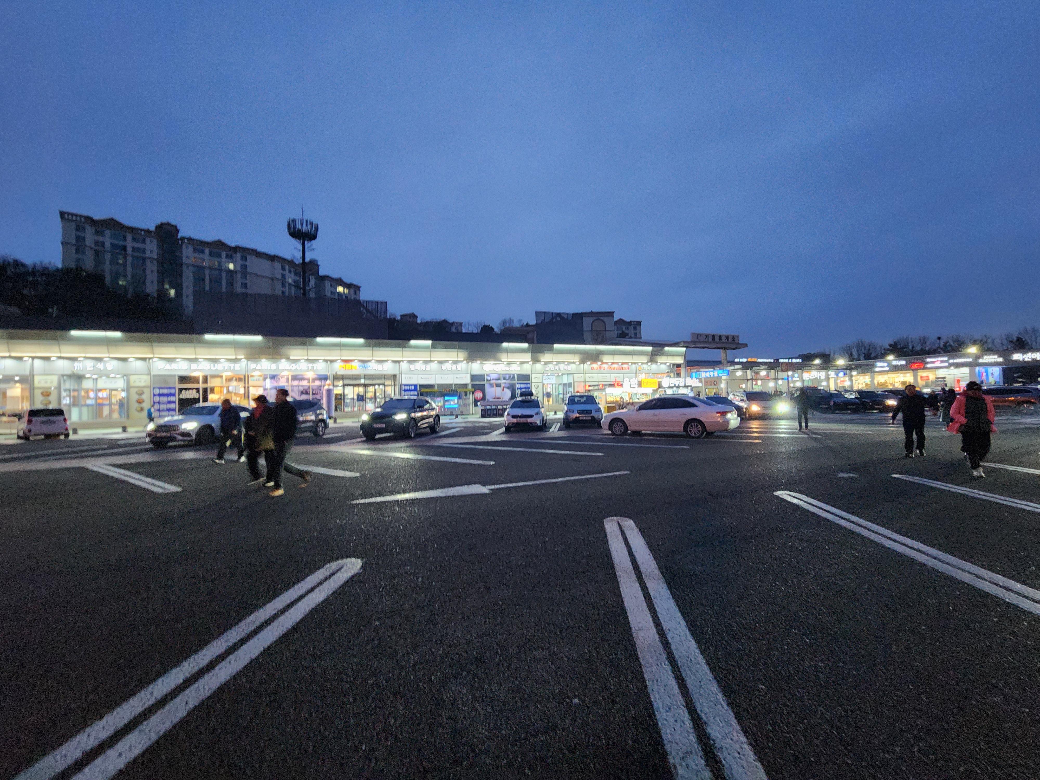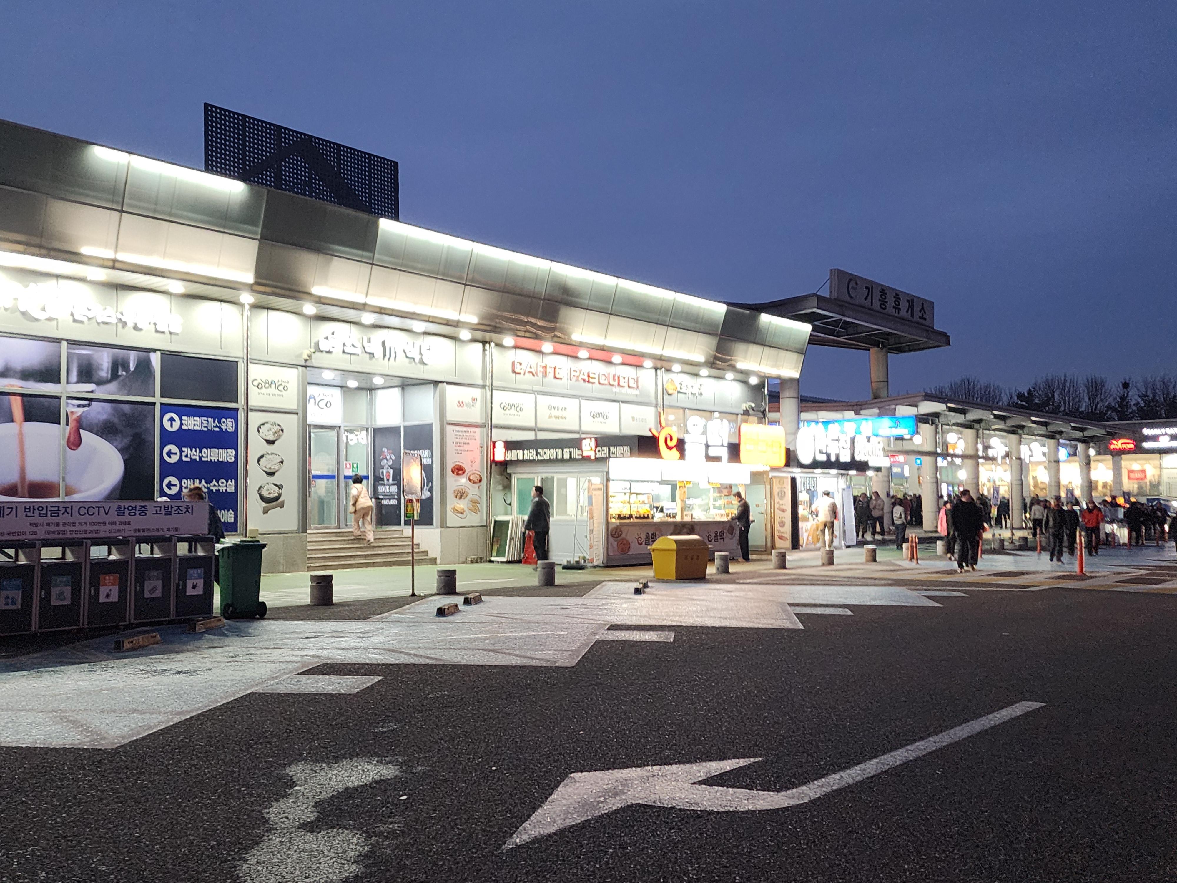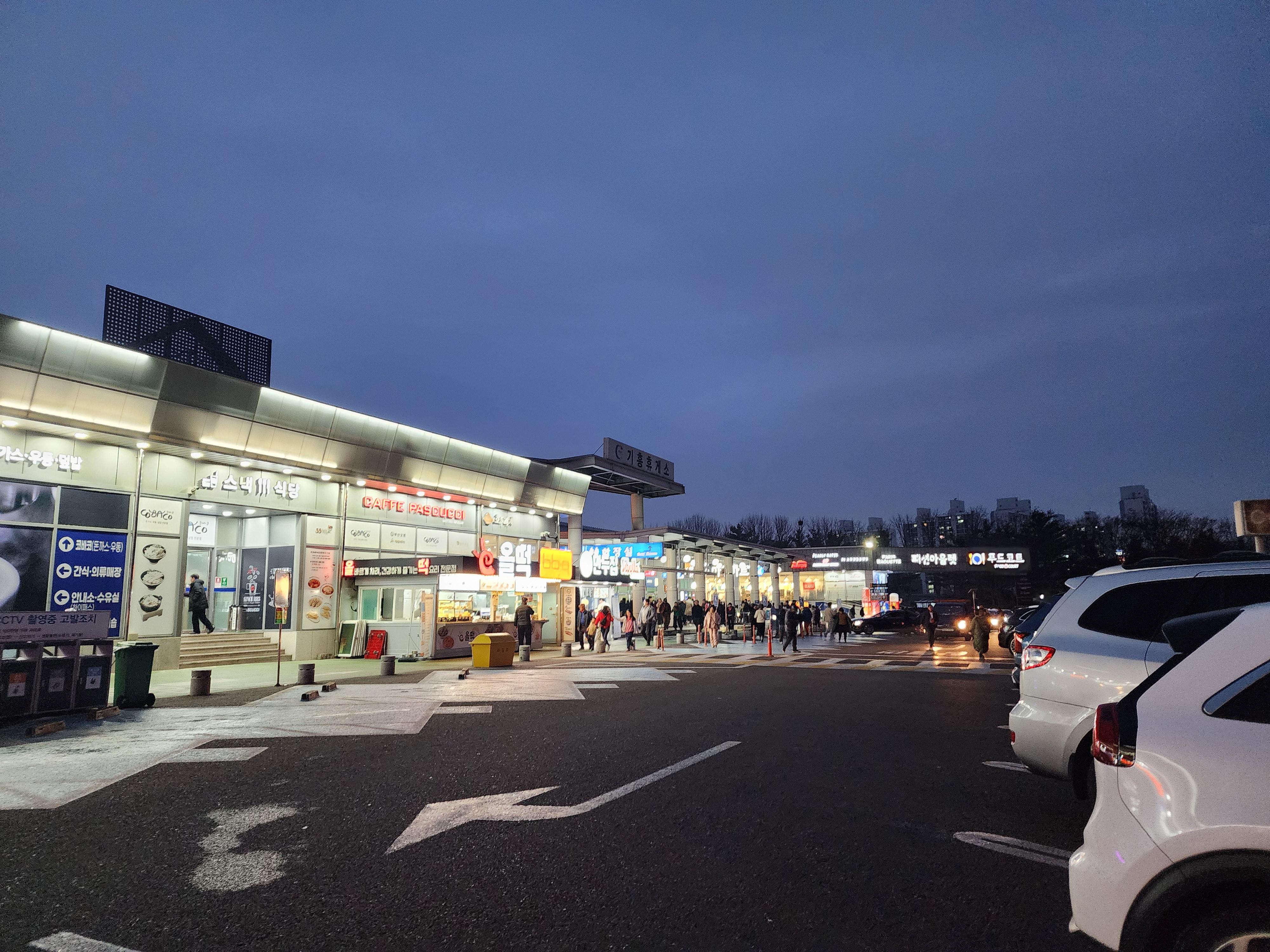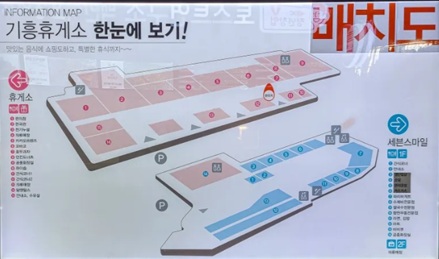 우선 기흥휴게소를 한눈에 보기 편하도록 배치도를 살펴보면, 두 구역으로 나뉘어 있는데, 왼쪽으로 가면 한국관과 코바코에서 국밥, 비빔밥, 된장찌개, 돈가스, 우동 등의 식사를 할 수 있고 또 핫바, 떡볶이, 소세지 등의 간식을 판매하는 간식코너, 편의점 등이 있다. 오른쪽으로 가면 세븐스마일이라는 곳이 있는데 이쪽에서도 돈가스, 짜장면, 쌀국수, 라면, 김밥, 비빔밥, 국밥 등을 먹을 수 있는 전문 식당가가 넓게 마련되어 있다. 메뉴는 세븐스마일이 더 많다.