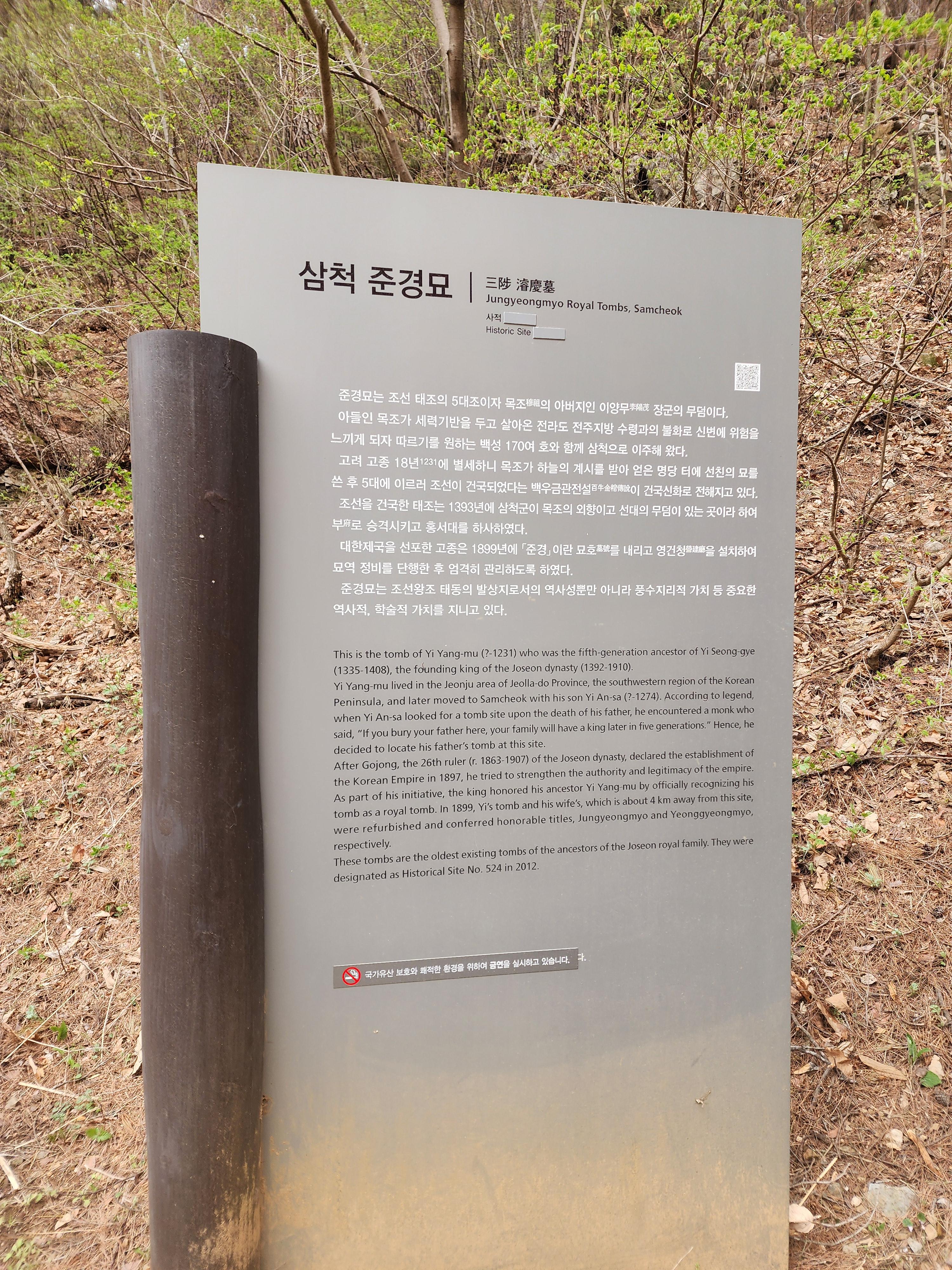 저는 전주이씨대동종약원대구지원에서 버스 1대로 삼척시 준경묘 재래행사에 간다고 하여 신청하고 갔다 왔다. 그런데 준경묘는 산중턱에 있어 약 2.0Km를 걸어 올라가야 다다를 수 있다. 처음 800m는 가파르게 올라 가야 하고, 그 다음 1.2km는 완만하게 올라가면 되었다. 준경묘에 가까이 가보니 과연 명당이라는 것을 바로 느낄 수 있었다. 어떻게 산골짜기에 그렇게 넓고 좋은 평지가 있는지 의의하게 생각되었다. 청명제는 약 40분정도 걸쳐서 행하여졌다. 그리고 행사를 마친 후에는 하산한 다음 재실에서 점심을 먹고 나서 대구로 내려왔다. 점심은 삼척지원에서 준비한 순두부국과 두부정식으로 식사를 하였다. 준비한 관계자 여러분들께 거듭 감사를 드린다.