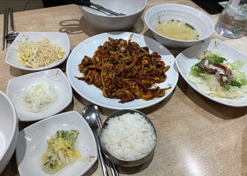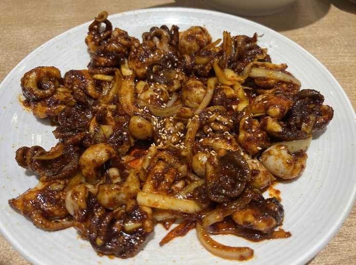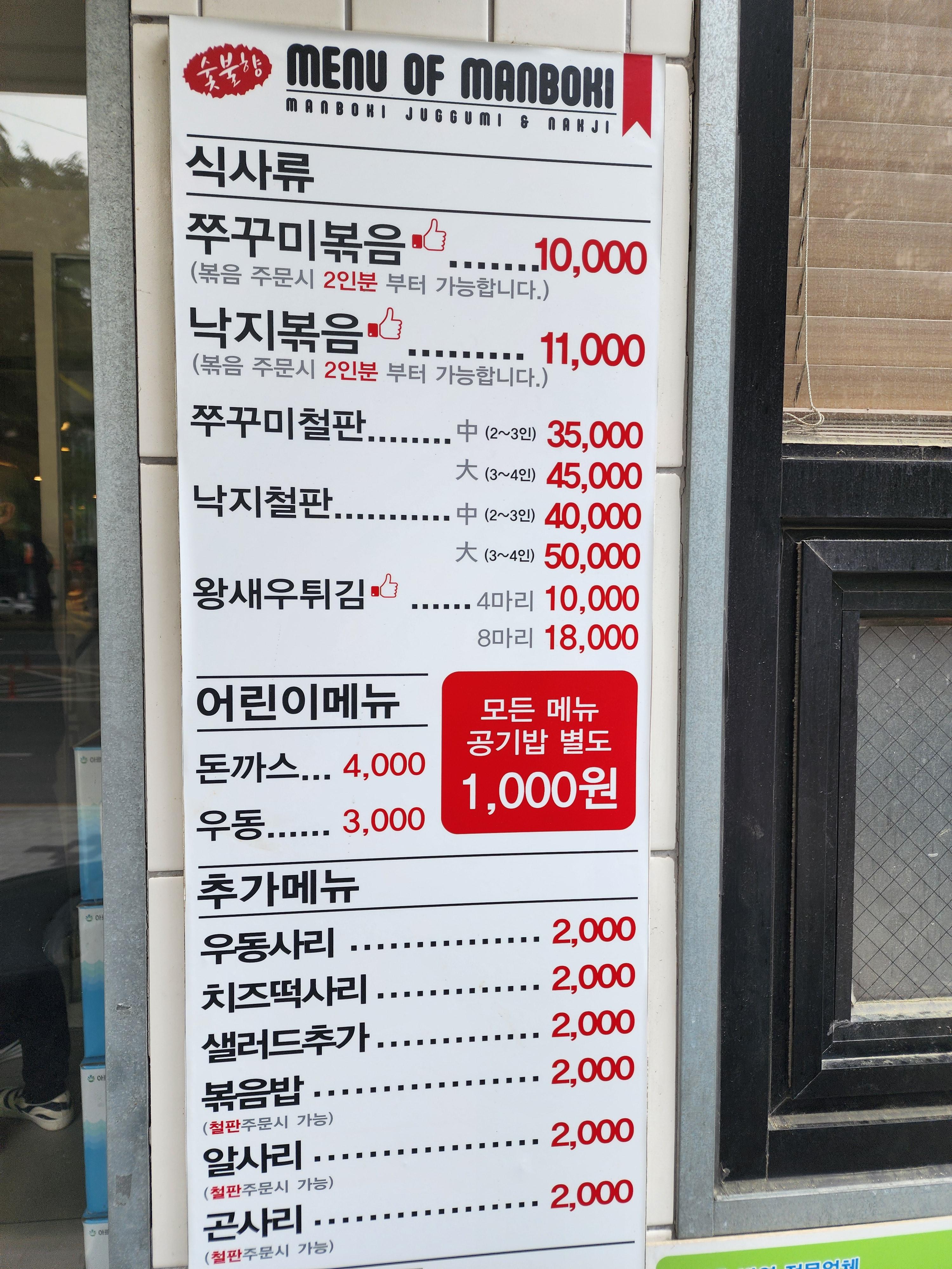 저희는 평일 점심시간에 갔는데 약 20분정도 웨이팅한 다음 들어갔다. 평일에는 계속 줄을 선다고 하였다. 대표 메뉴는 주꾸미볶음이며, 낙지볶음, 새우튀김 4마리 등을 맛볼 수 있다. 어린이 메뉴로는 돈가스와 우동이 있다.