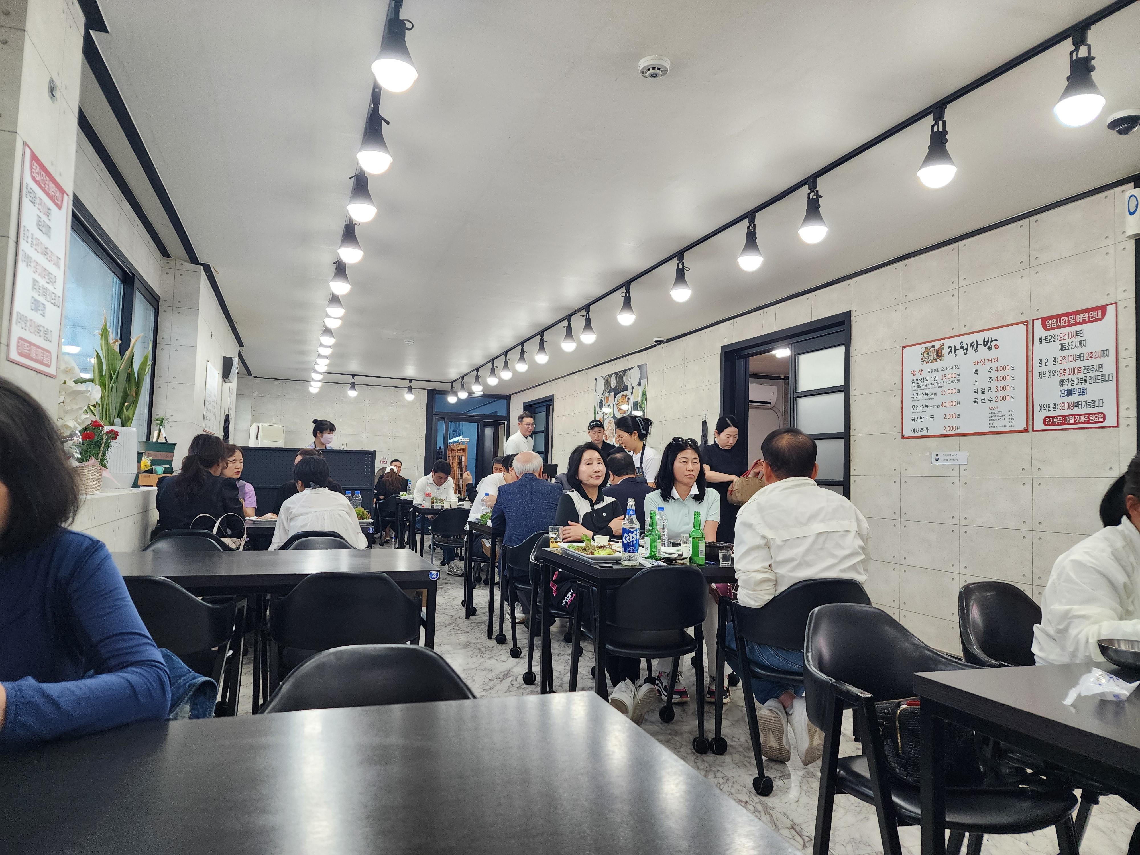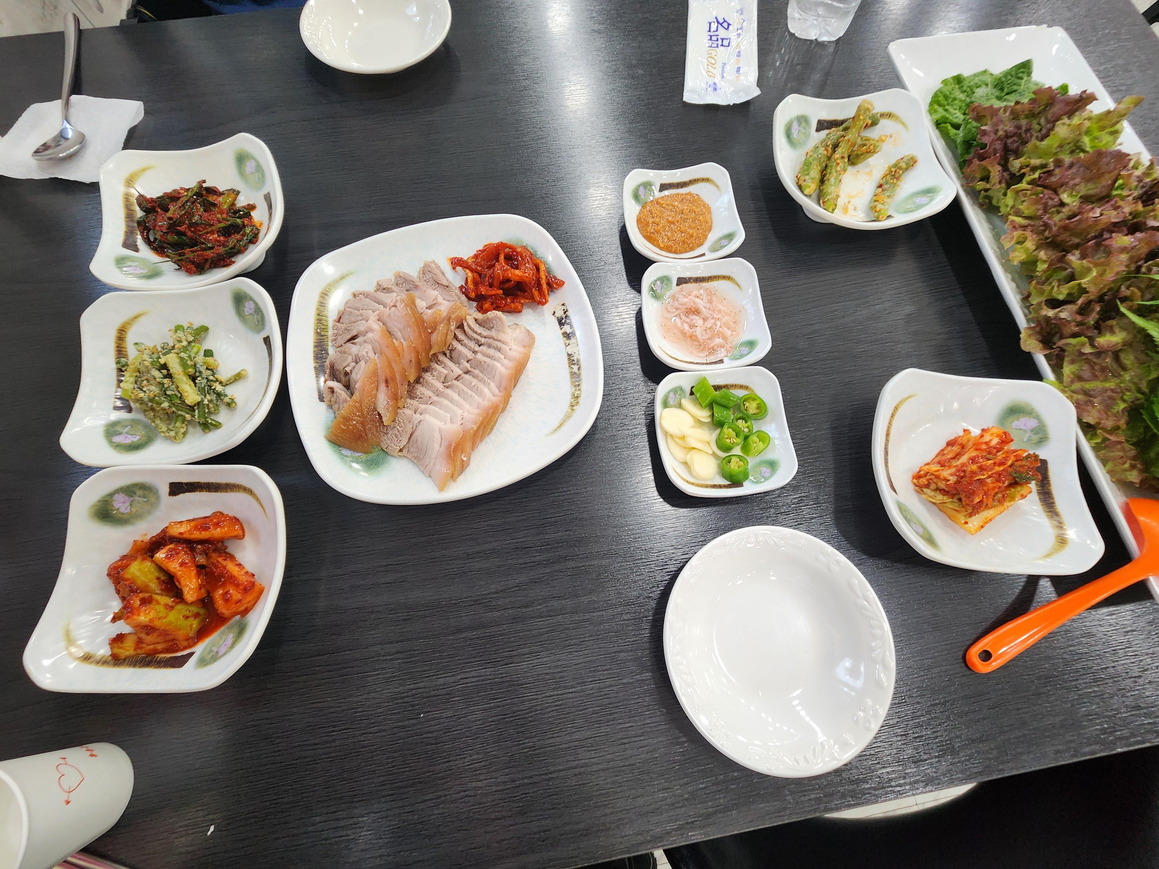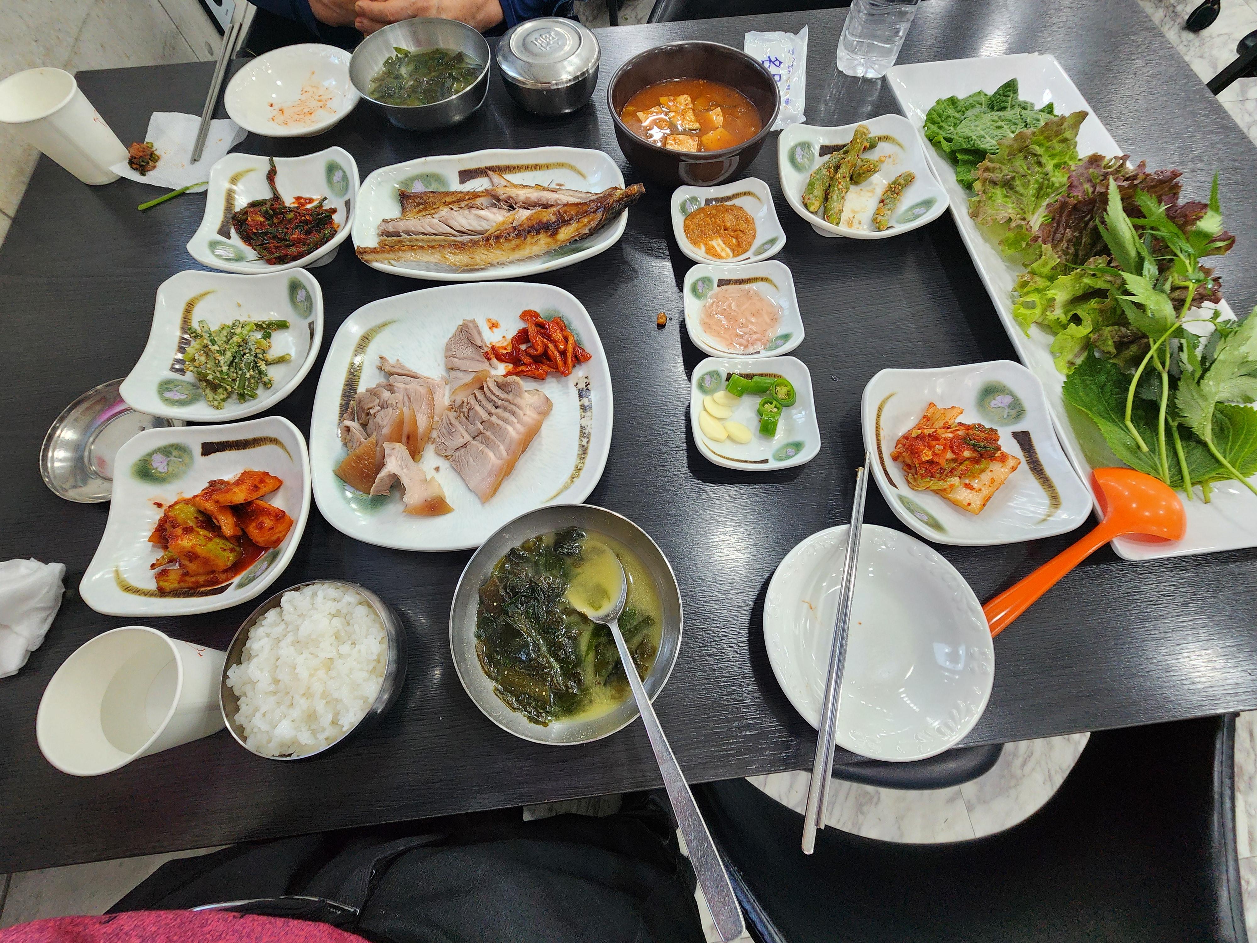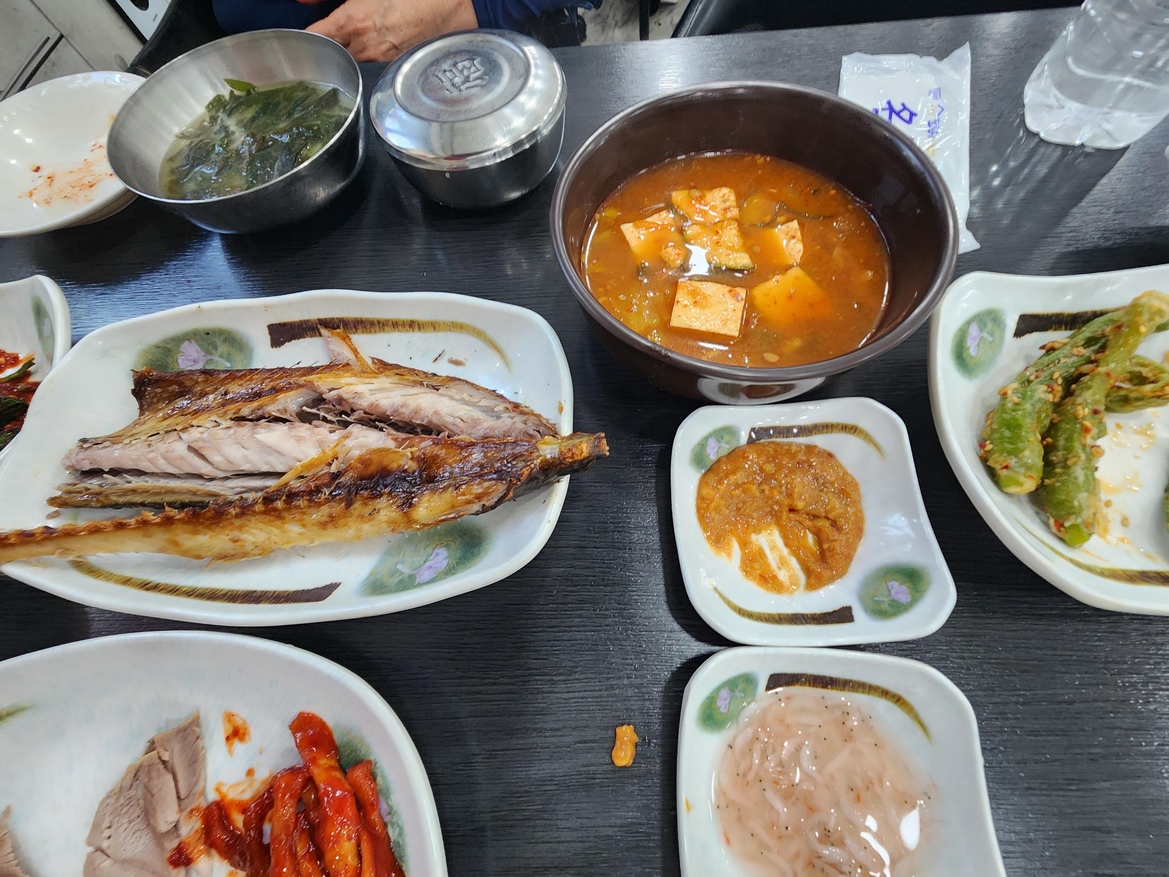 예약 주문하면, 자리에 앉자마자 바로 기본 반찬이 차려진다. 싱싱한 야채와 새우, 멸치젓갈, 다시마, 양배추 쌈, 각종 나물 무침, 감자 등으로 밑반찬을 먹음직스럽게 차려준다. 조금 뒤에 고등어가 나오는데 큼직하니 아주 맛깔나게 구워서 내온다.