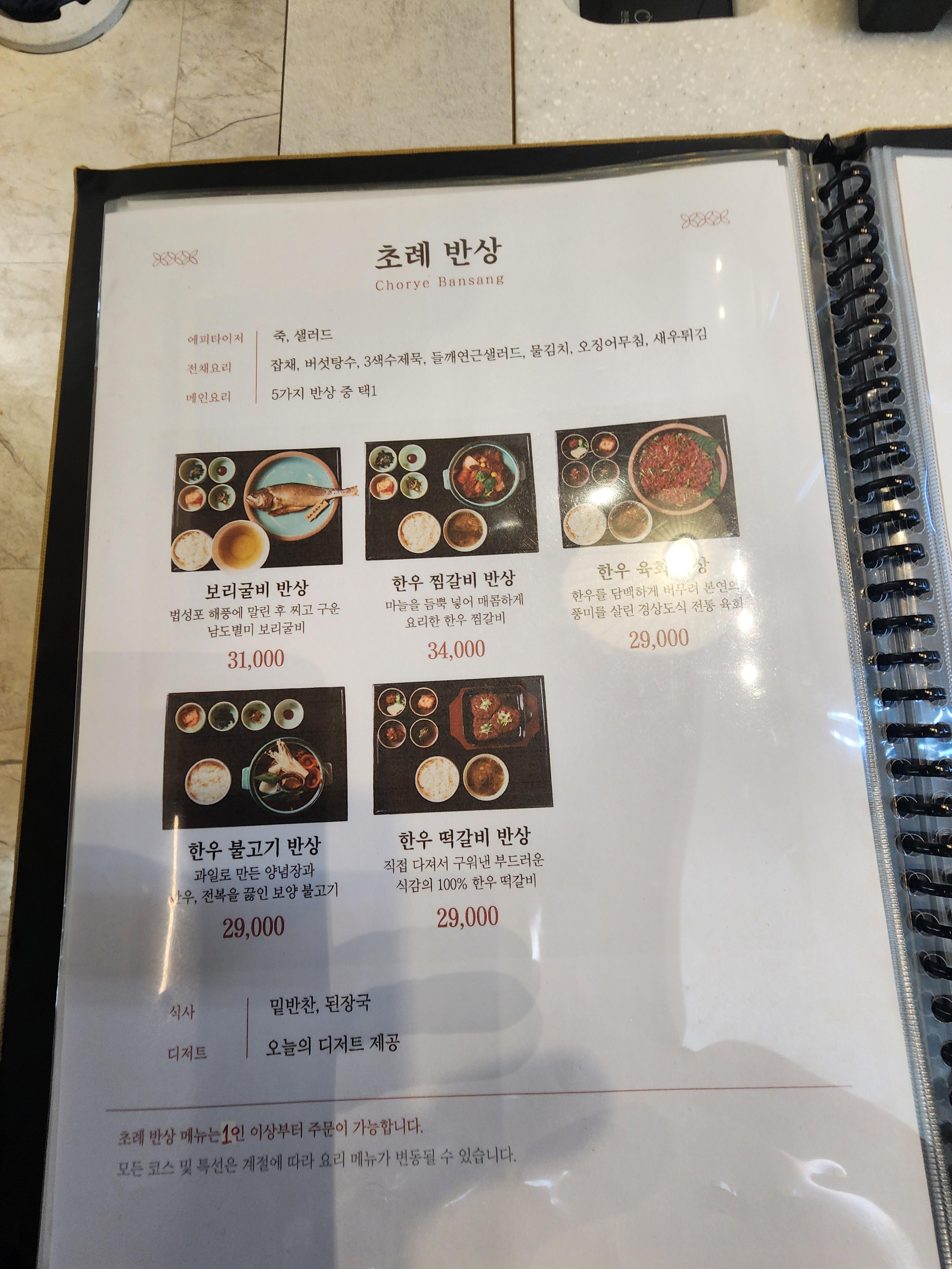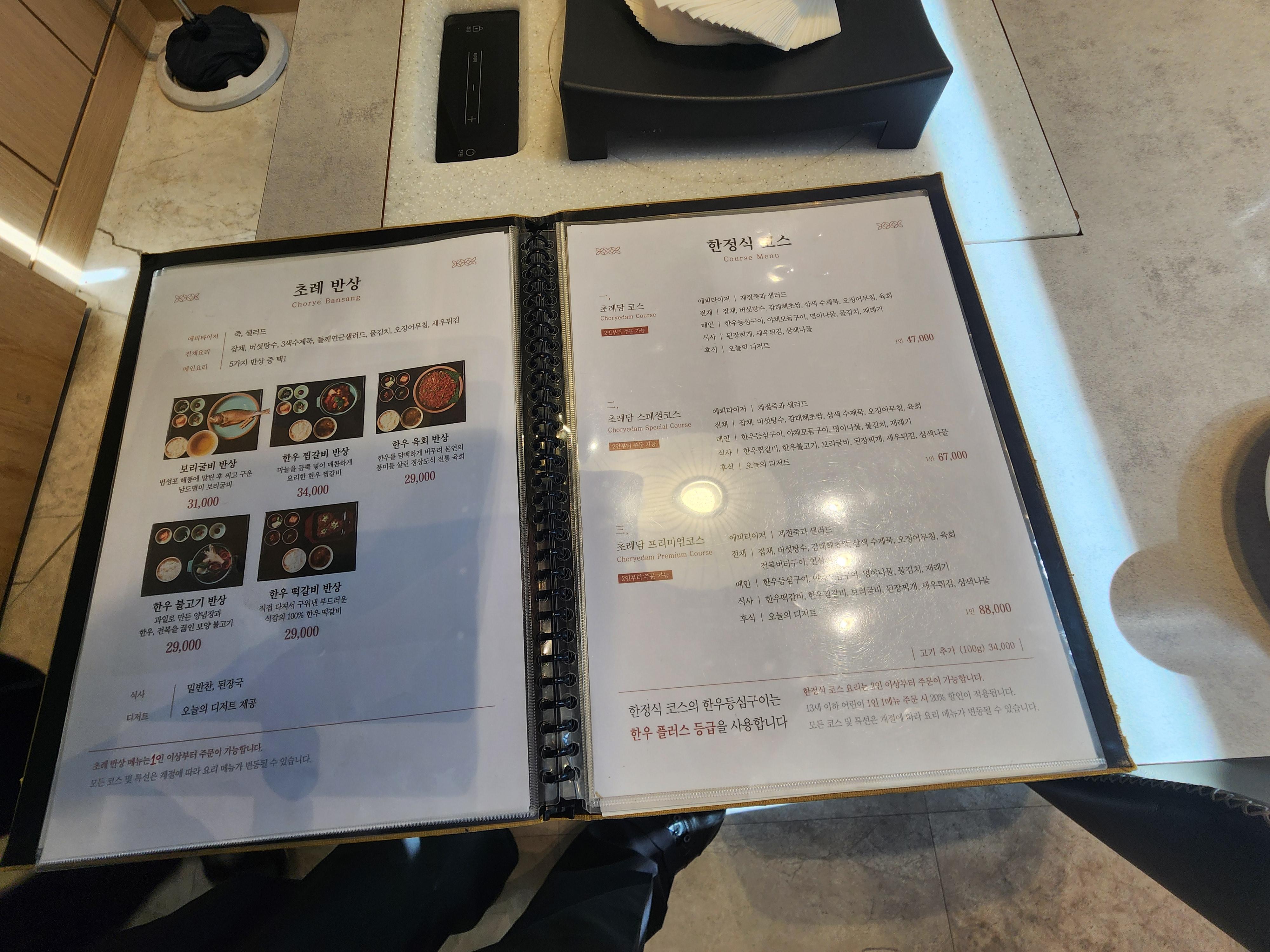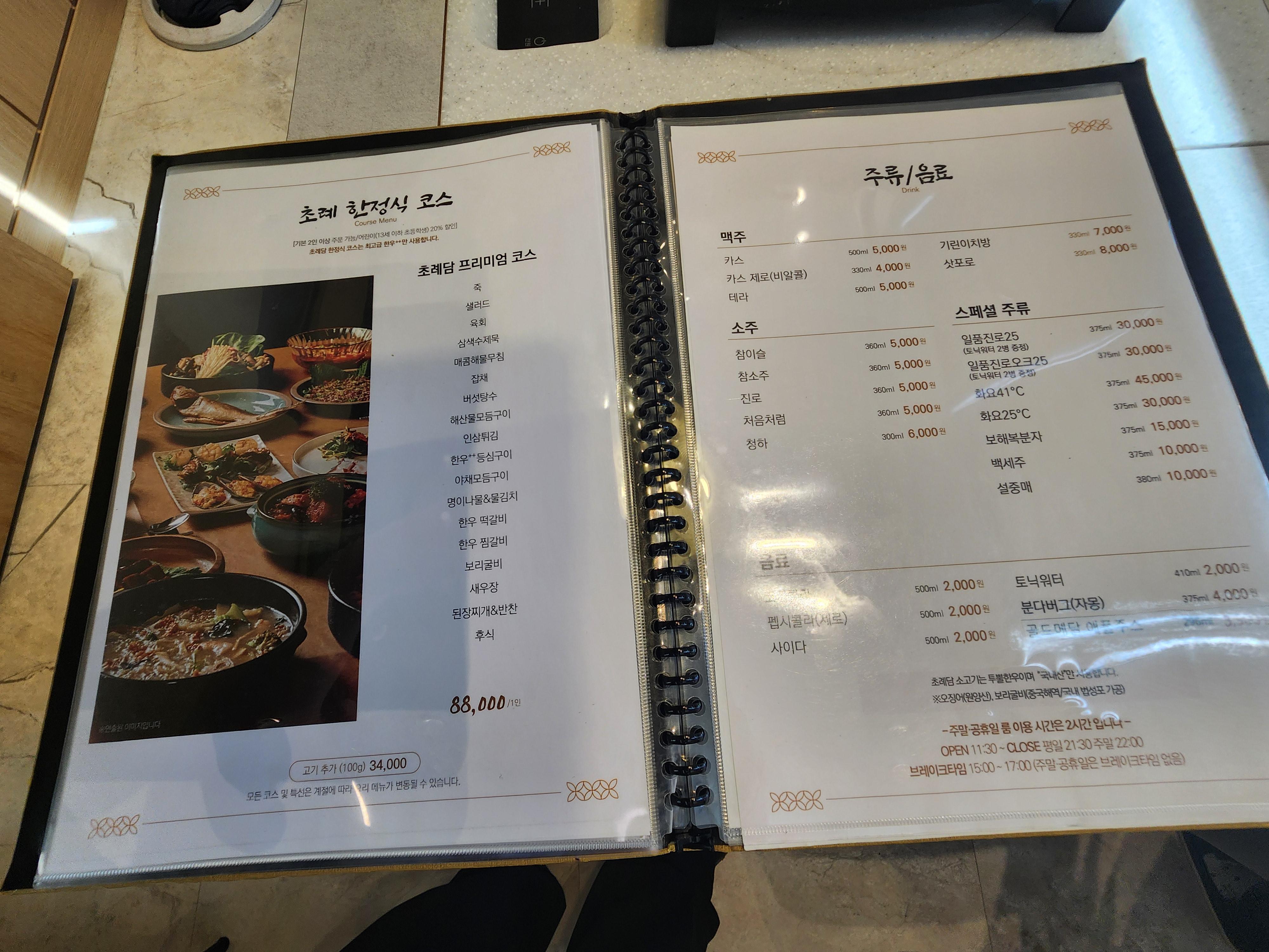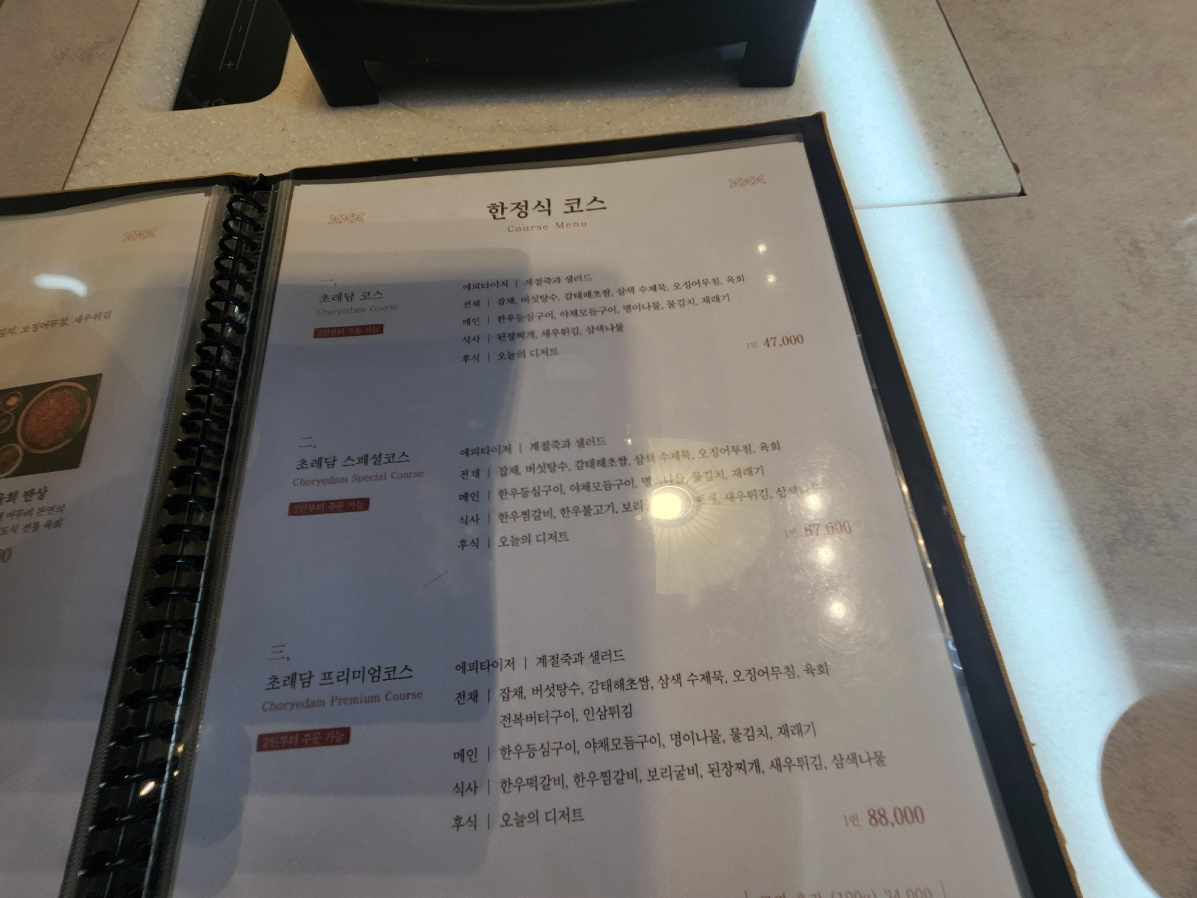 ▶ 메뉴판; 한정식코스; 1인당 초례담 코스 47,000원, 초례담 스페셜코스 67,000원, 프리미엄코스 88,000원