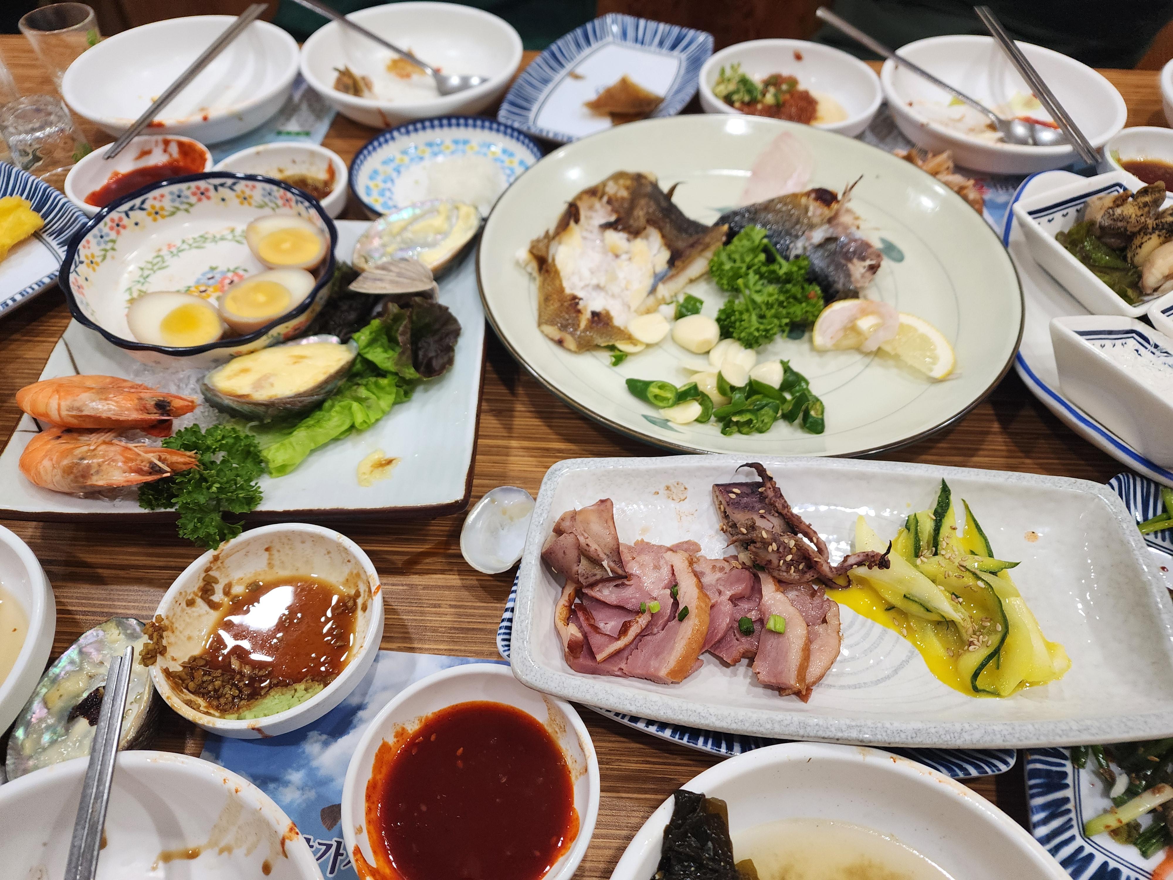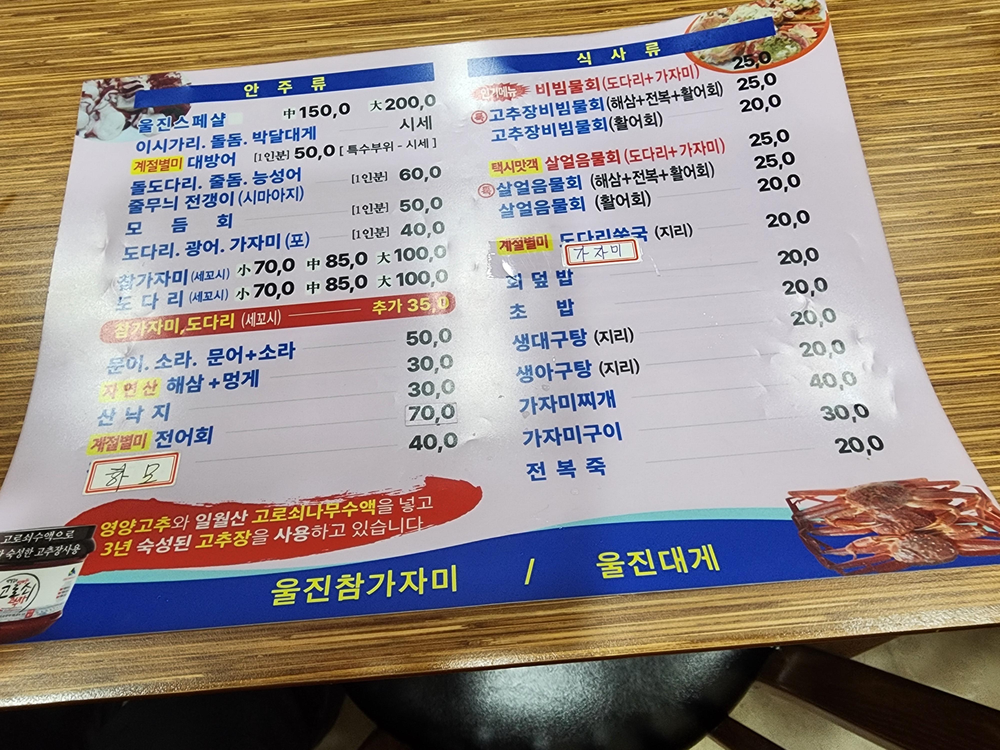 ▣ 메뉴(2025.8); 울진 스페셜 소 13만 원, 중 15만 원, 대 20만원, 돌도다리, 줄돔, 참도다리 등 1인분 6만원, 모듬회 1인당 5만원, 도다리와 광어 1인당 4만 원, 문어와 소라 5만 원, 해삼+멍게 3만 원, 산 낙지 3만 원/ 식사류; 고추장비빔물회(도다리+가자미) 1인분 2.3만 원, 고추장비빔물회(해산+전복+활어회) 2.5만 원, 살얼음물회(도다리+가자미회) 2.5만원 회덮밥과 초밥 2만 원 등/ 과거에 비해 요금이 많이 올랐다.