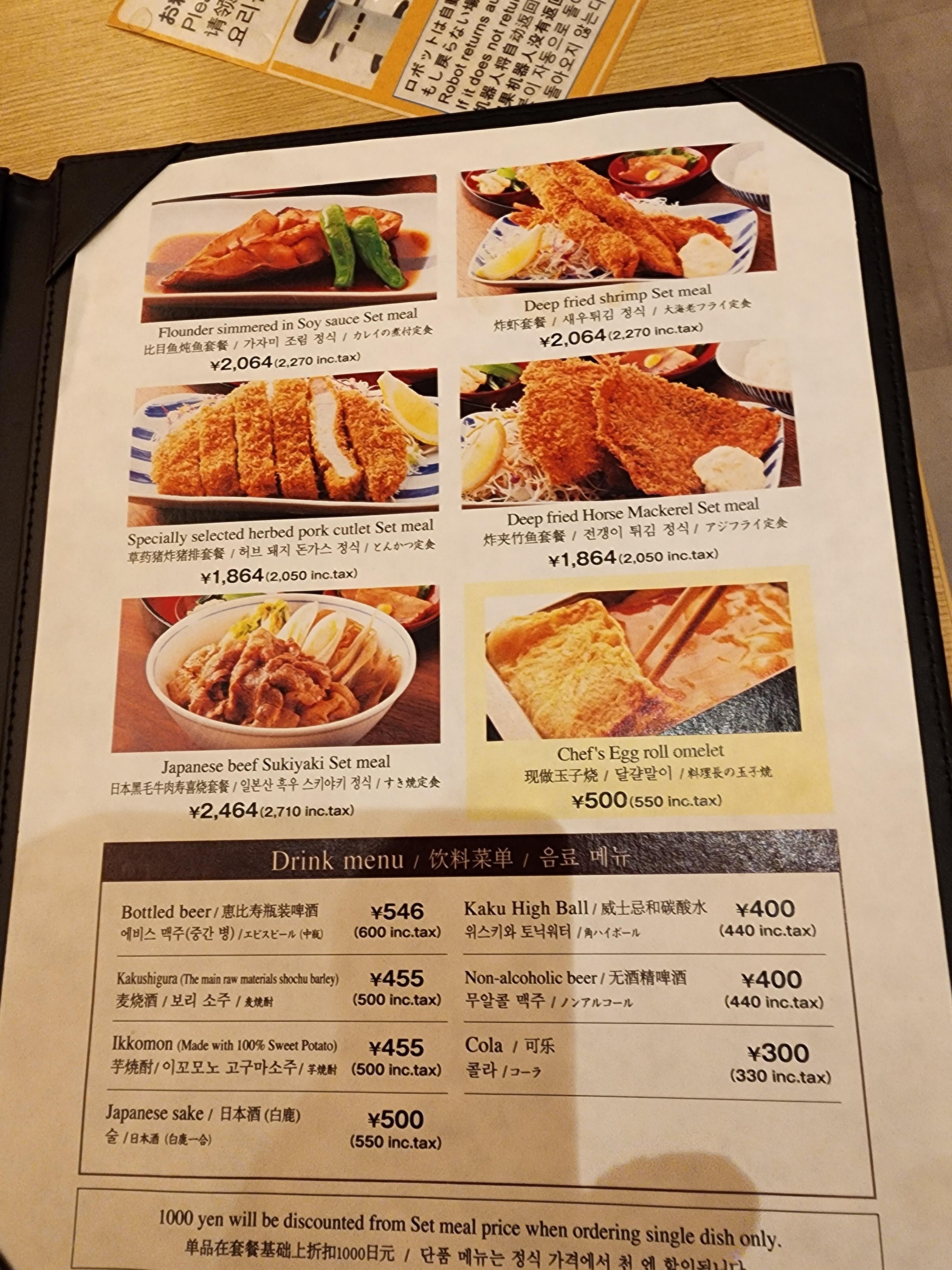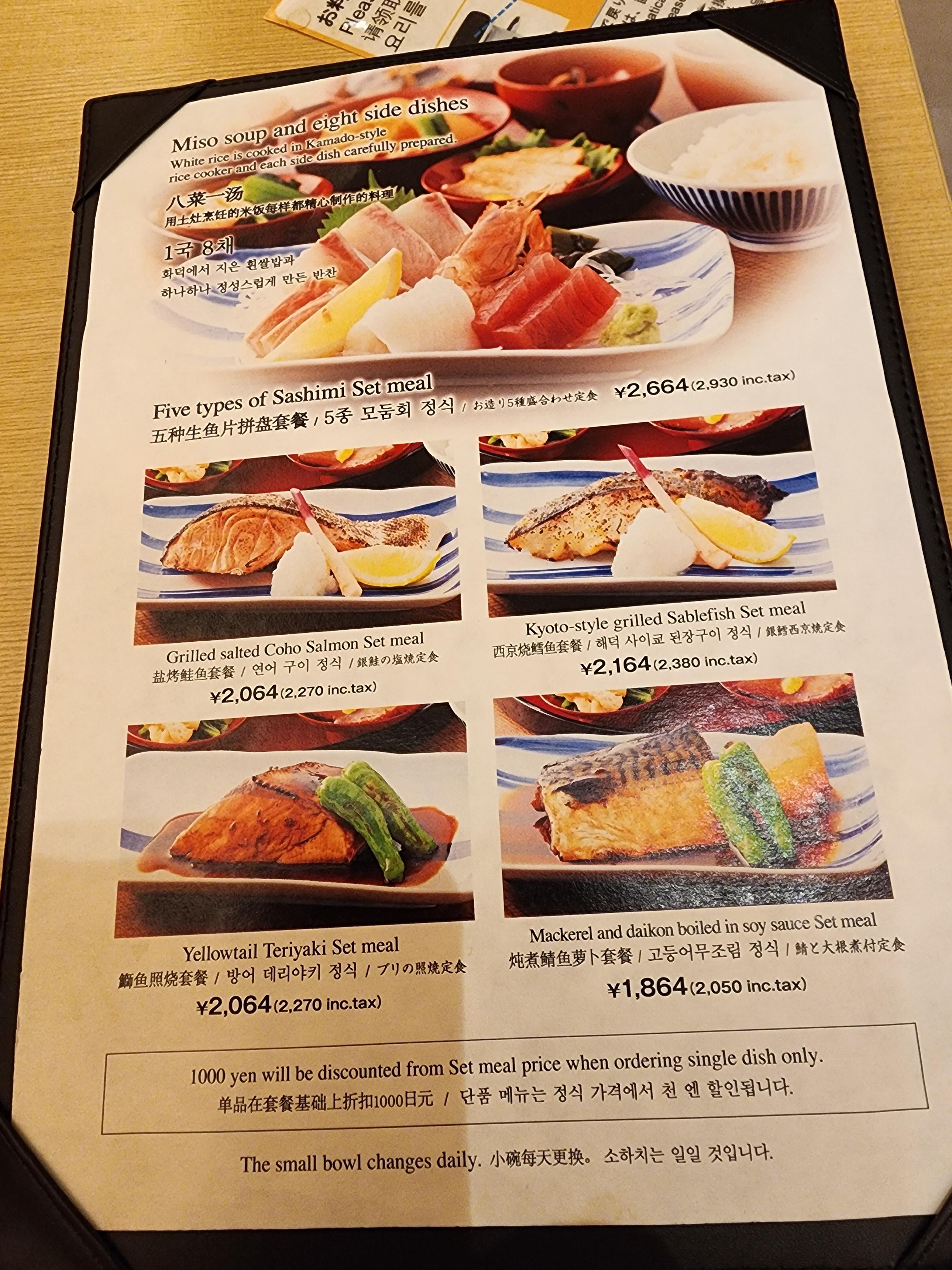 우리 일행은 일본 회정식을 시켰는데, 보기에는 좋았지만 제 입맛에는 별로였다. 회는 양이 많았고 반찬 종류도 많은 편이었다. 가격도 다른 식당에 비해서는 비싼 편이었다. 10층에는 다양한 종류의 식당과 한국식 식당도 있으니 골라서 선택하면 될 것 같았다.