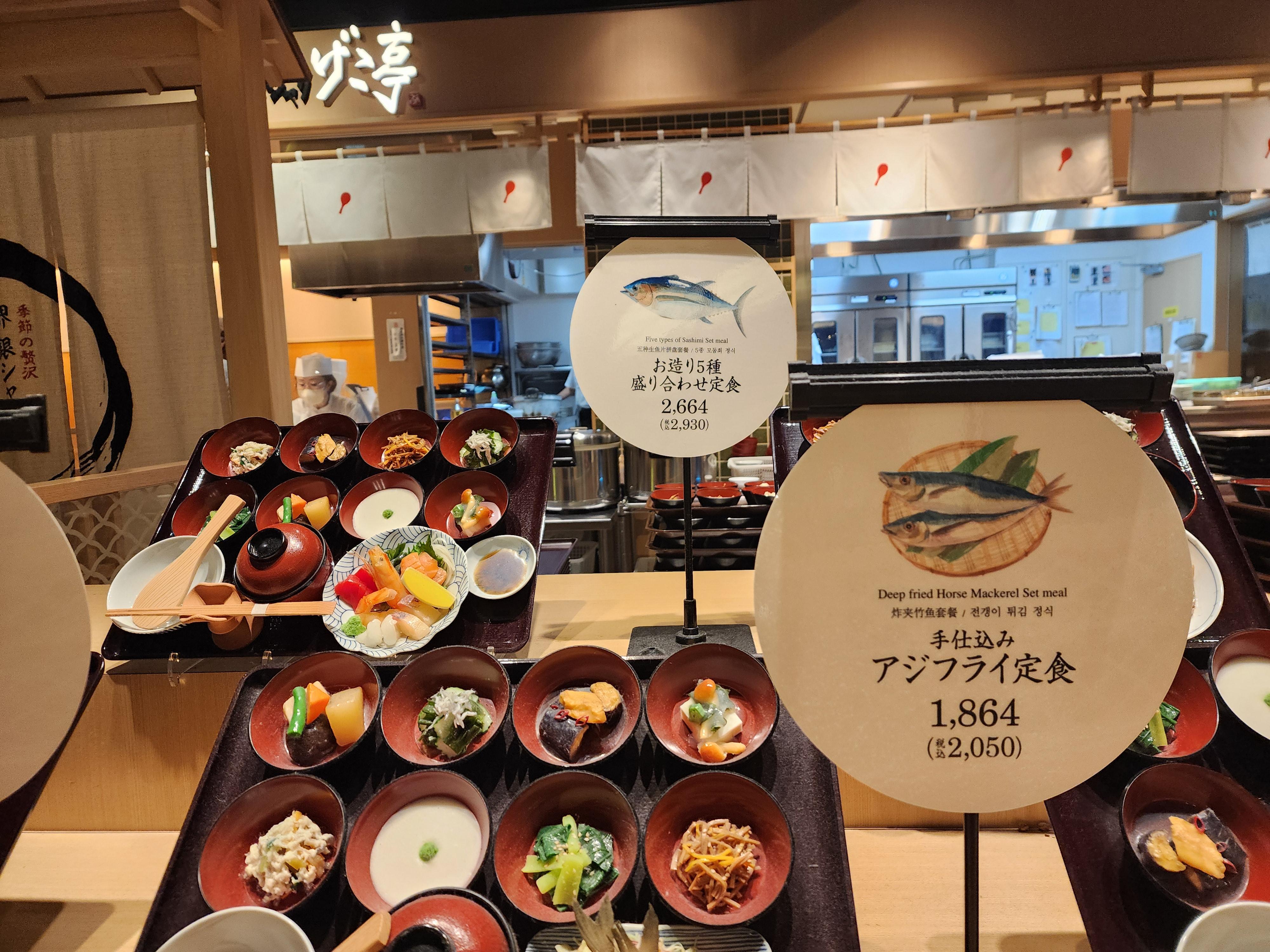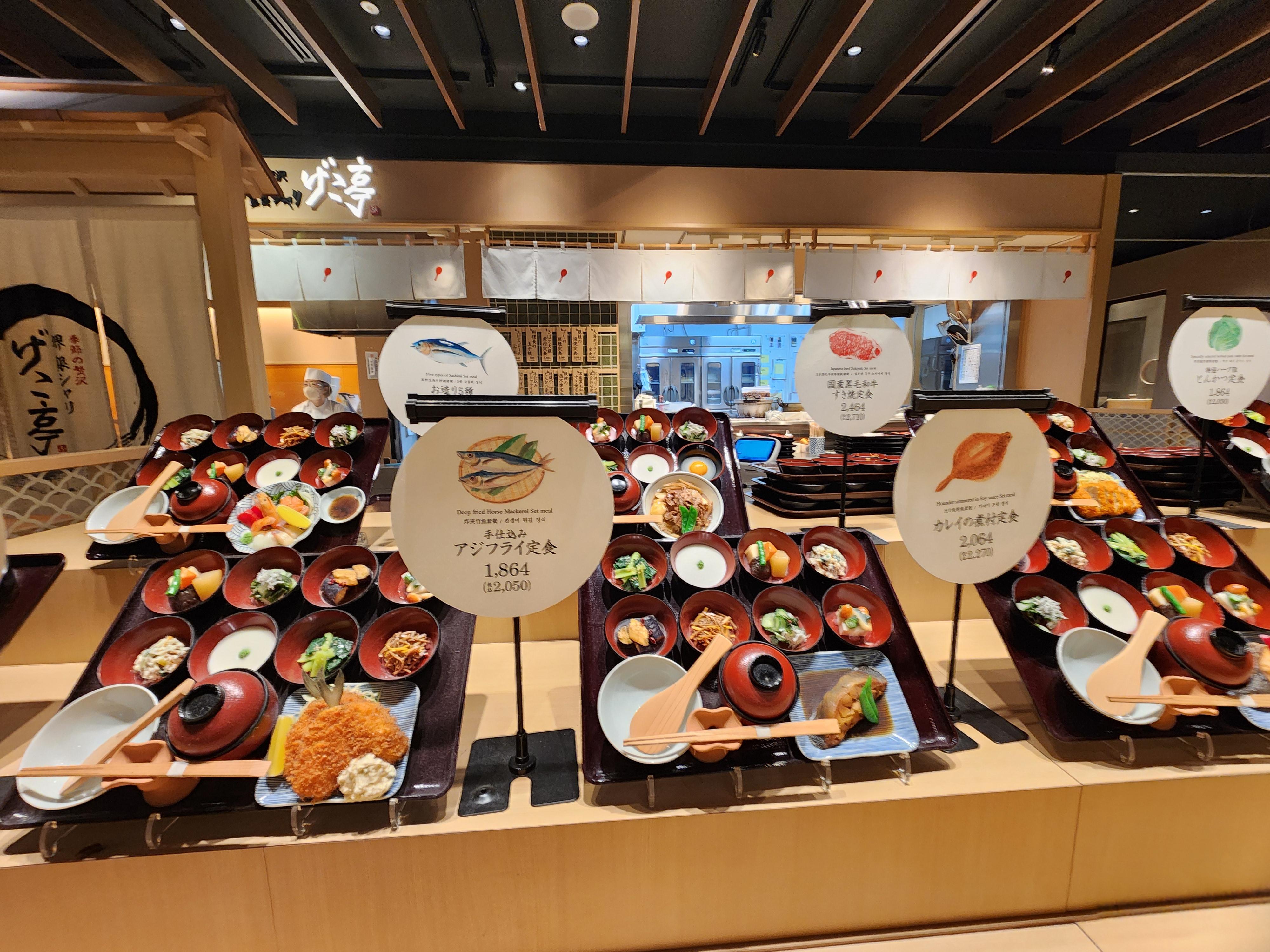 일본 오사카 중심가 신사이바시 다이마루백화점 10층 식당가에는 "키세츠노제이타쿠 사카이 긴샤리 게코테이" (季節の贅沢 堺 銀シャリ げこ亭 大丸心斎橋店) 라는 일본 정식 식당이 있다. 이 식당은 밥과 다양한 정식 메뉴를 제공하며, 메뉴 모형이 있어 메뉴 선택이 용이하다.
