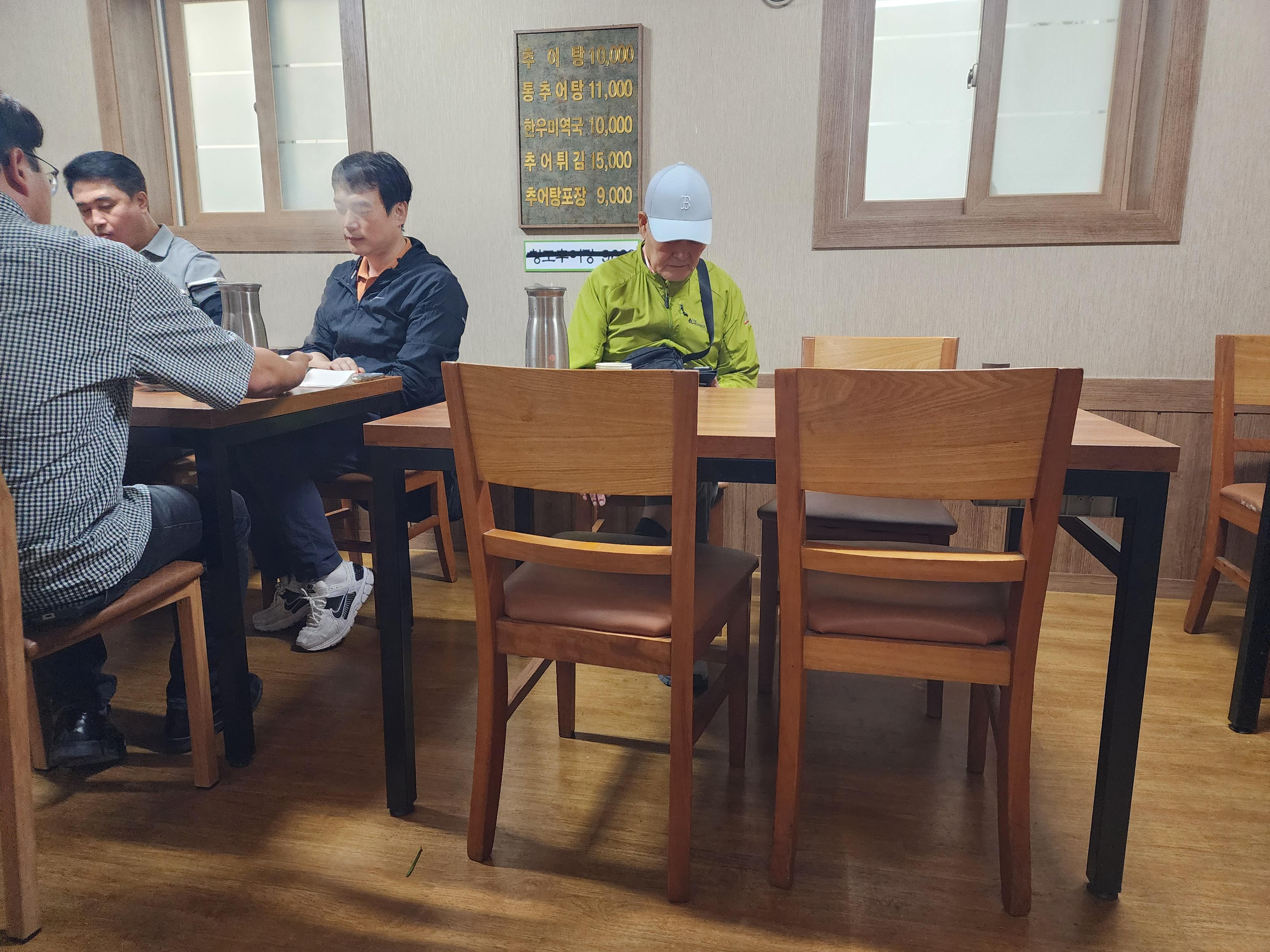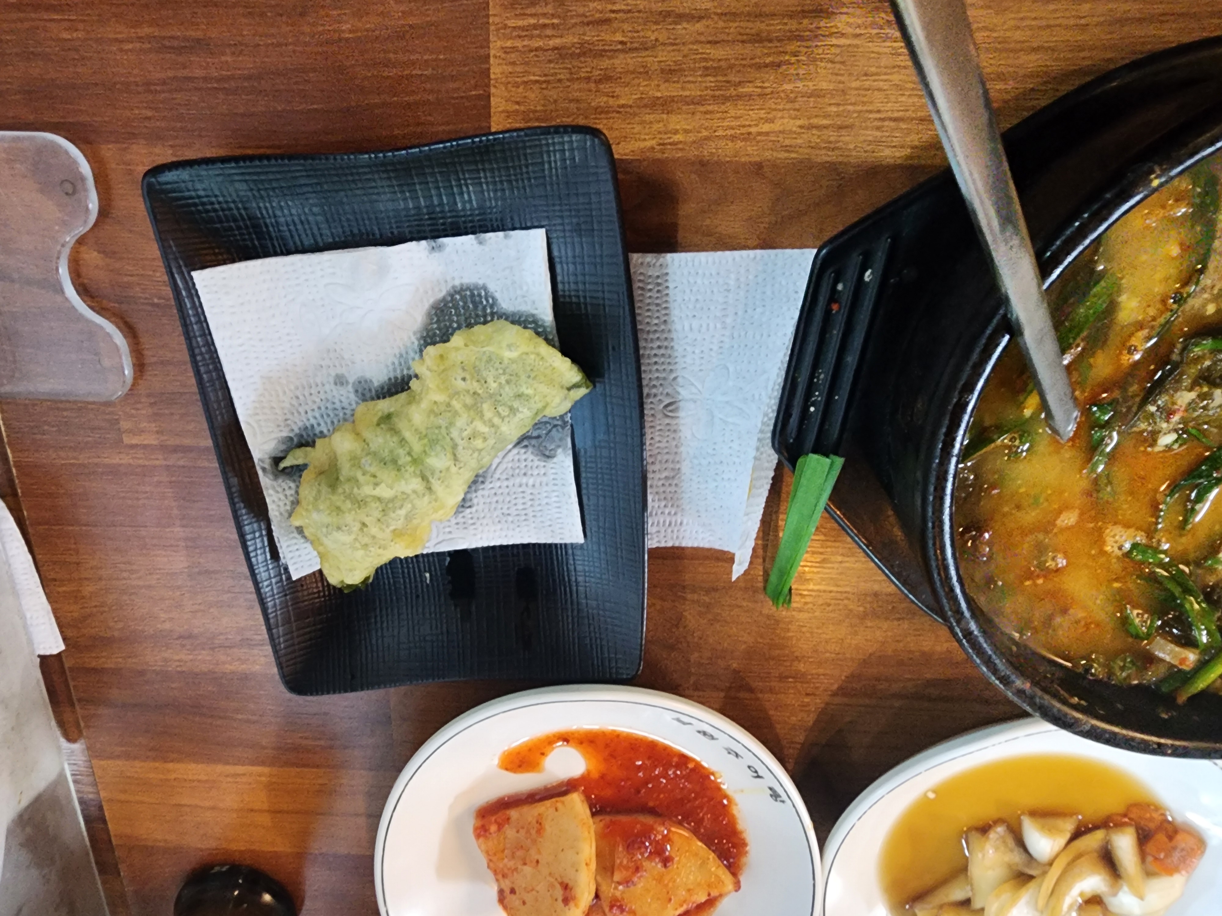 내부와 방 모두 4인이나 2인 입식테이블로 되어 있어 좋았다. 1명도 들어갈 수 있다. 기본반찬으로 김치와 양파피클, 야채튀김 한 조각과 추어탕에 넣어 먹을 소면과 부추등이 나온다.
