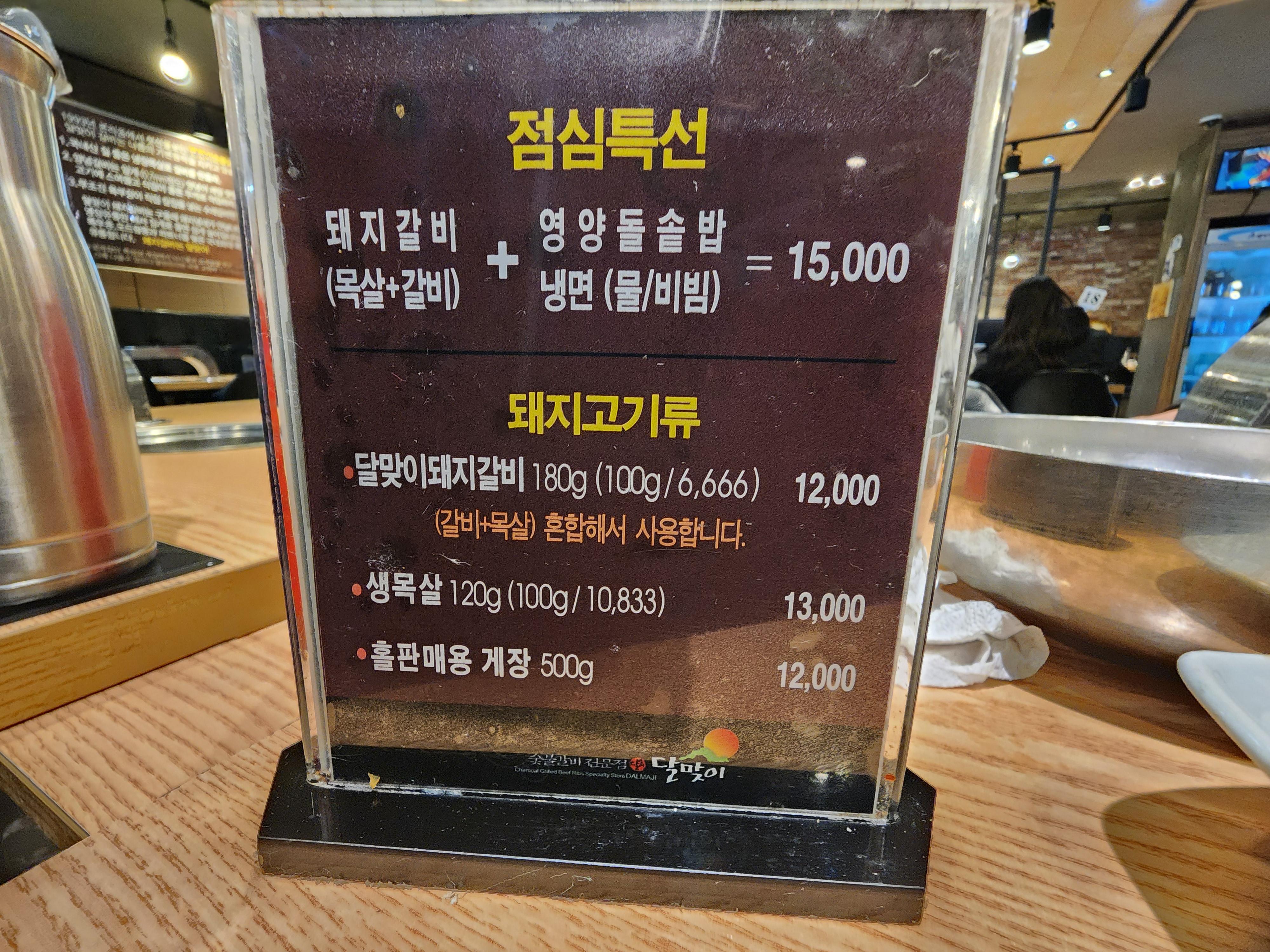 달맞이 돼지갈비 12,000원, 생목살 13,000원, 점심특선(돼지갈비+돌솥밥 or 물/비빔냉면 15,000원/ 점심특선(생목살 120g+영양돌솥밥) 15,000원/ 고기 드신 후 냉면(물/비빔) 6,000원. 음료수 2,000원 등/ 한우도 판매한다.