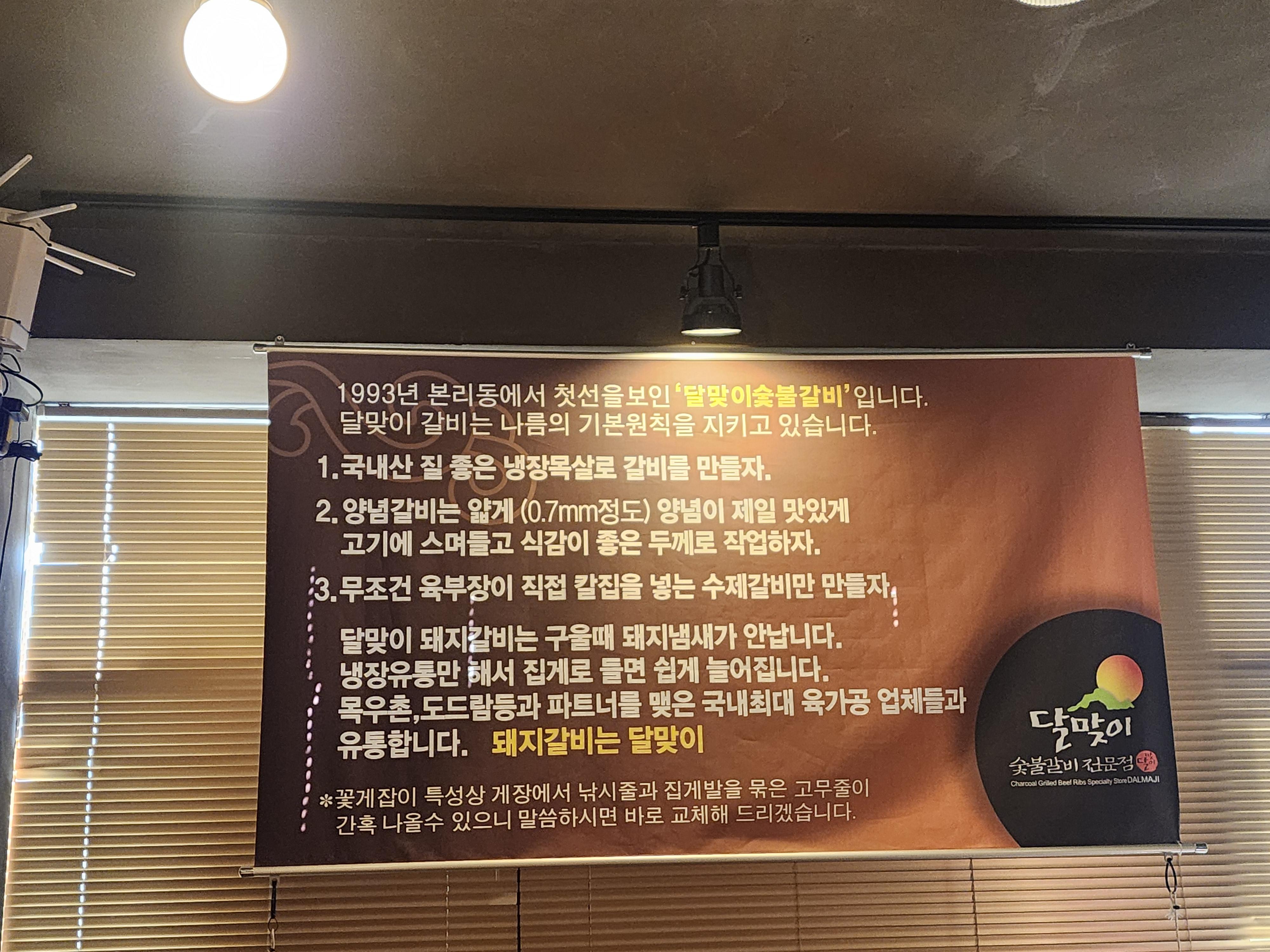 1993년에 개업한 달맞이 돼지갈비는 질 좋은 프리미엄 목살을 냉장보관하여 8mm정도 두께의 목살에 양념이 골고루 잘 베이도록 숙련된 고기장인이 직접 양쪽으로 칼집을 내서 그런지 상당히 연하고 좋았다. 그래서 간혹 집게로 들면 쉽게 늘어나거나 시간이 지나면 쉽게 굳을 수도 있다. 한마디로 달맞이는 수제갈비를 고집한다고 한다.