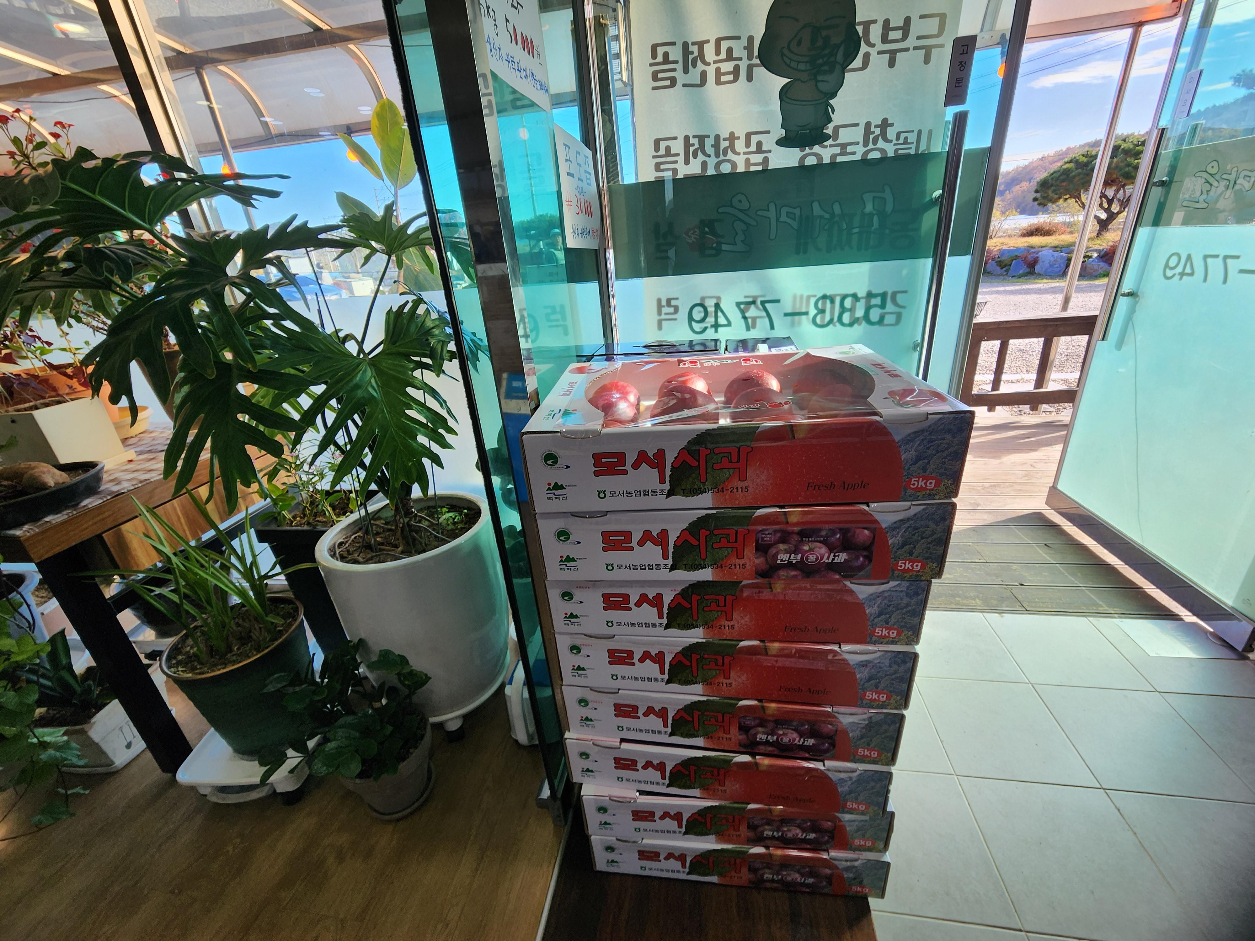 ▶ 식당 입구에서 모서 사과 신품종 1박스에 5만원에 판매하고 있었다.