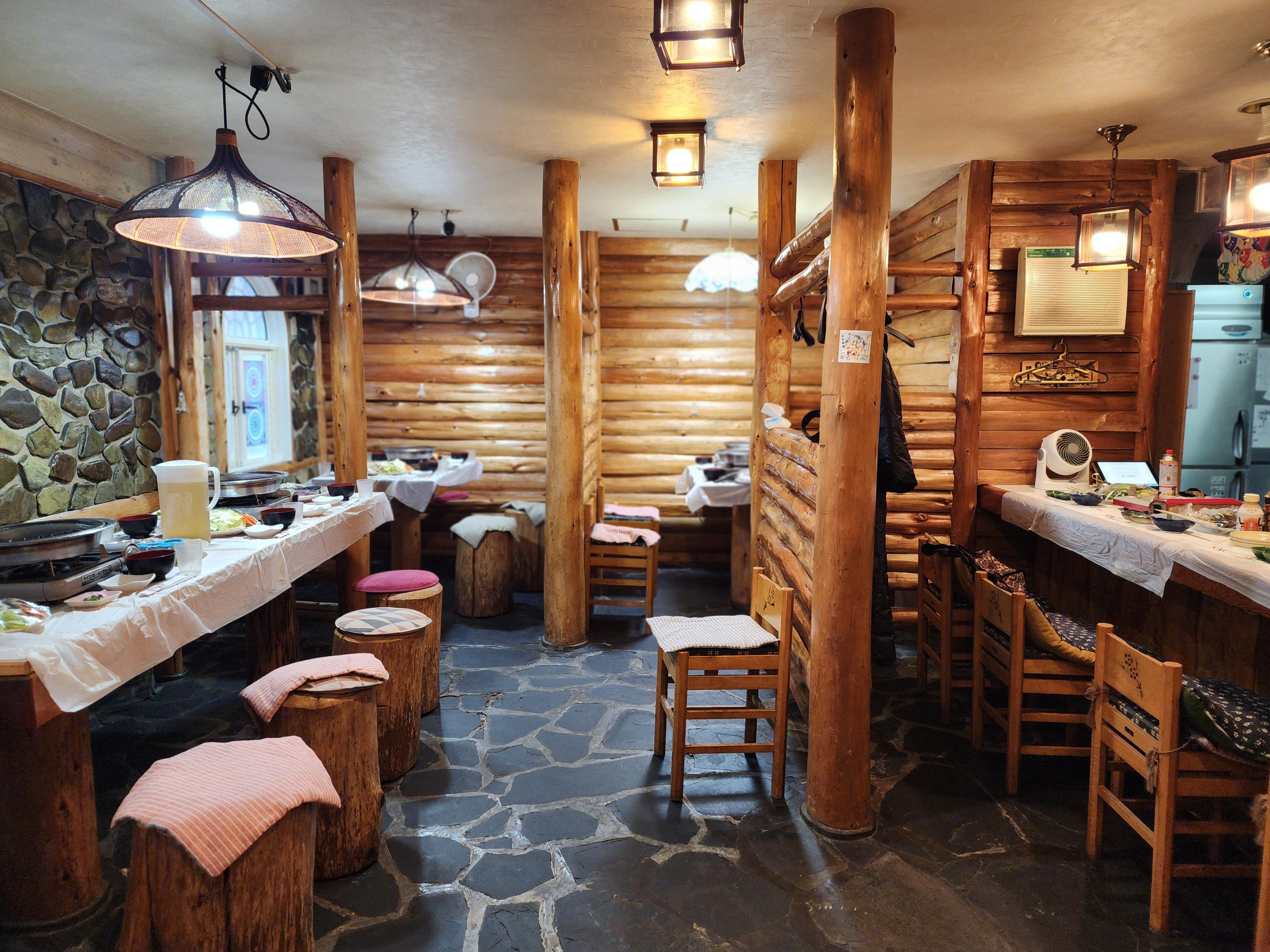 식당 1층에는 바(BAR)와 4~6인이 앉을 수 있는 홀이 있고, 2층에는 단체가 이용가능한 가변식 넓은 홀이 있다. 우리 일행은 2층에서 식사를 하였다. 실내 내부는 은은한 조명과 통나무 실내 인테리어로 되어 있어 깔끔하였다.