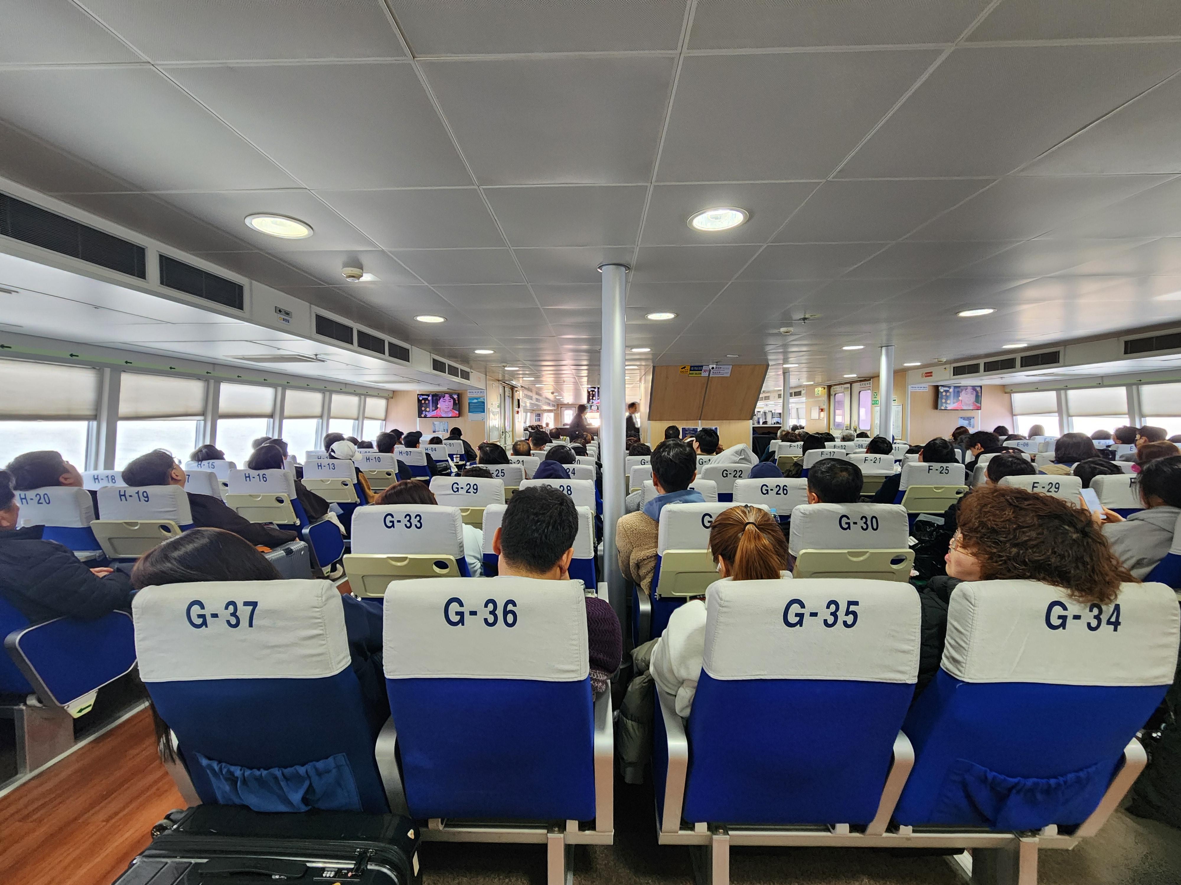 배 안 내부는 깔끔하고, 기본적인 편의 시설인 화장실과 매점(면세점) 등이 있었다. 배 멀미가 걱정되는 분들은 출발 전에 멀미약을 꼭 챙기는 걸 추천한다.