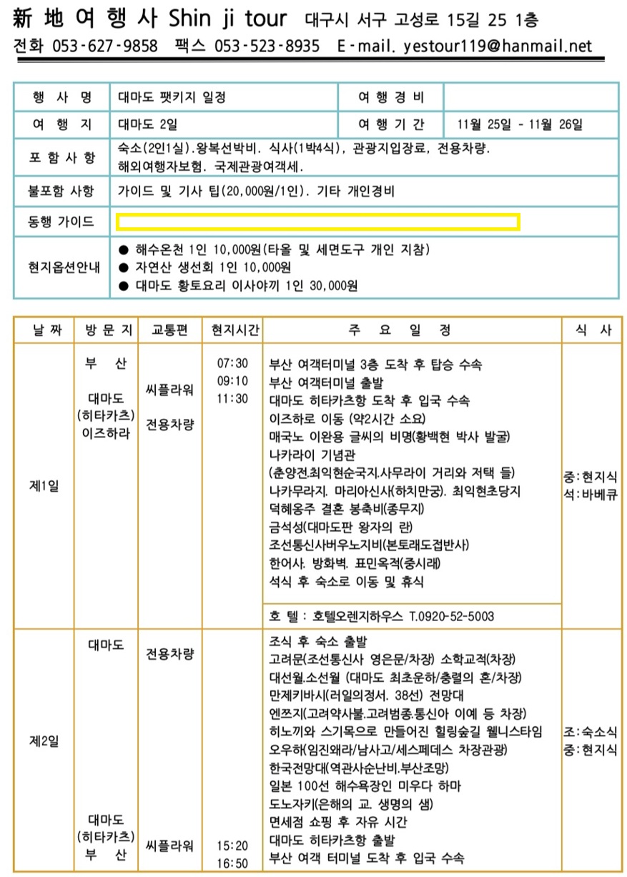 저는 이번에 대구 소재 신지여행사를 통해 갔다 왔다. 부산항에서 씨플라워를 타고 갔다 왔는데 가성비가 너무 좋아 다른 분들께 적극 추천한다. 저는 왕복 배편과 호텔 숙박, 식사 4번, 관광지 투어가 포함된 패키지를 이용했다. 생각보다 알찼고, 가성비가 너무 좋았던 일정이었다.