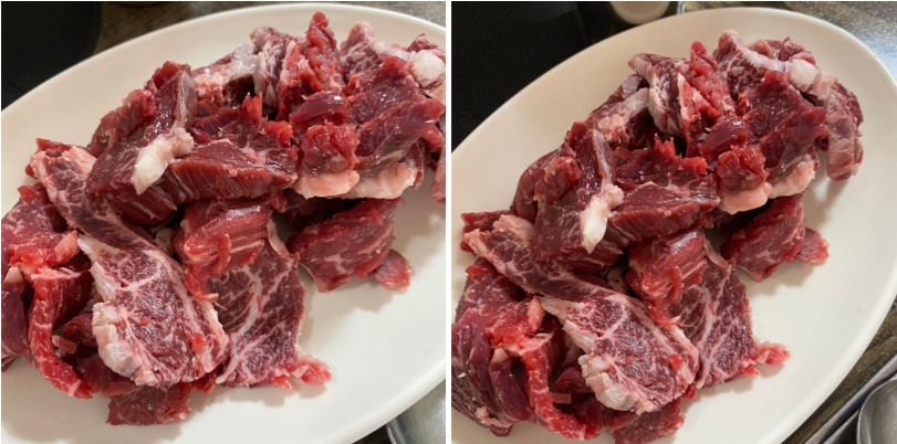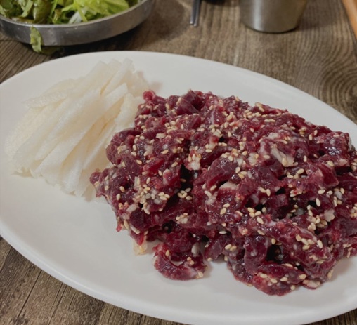 메뉴판을 보니 소고기가 토시(주먹시), 안창, 구이 등으로 구분되어 있어 주문하기 쉬웠고, 생고기와 육회 등이 있었다. 반 접시만 주문해 보니 육회는 안되고 생고기만 반접시된다고 해서 주문하였다.