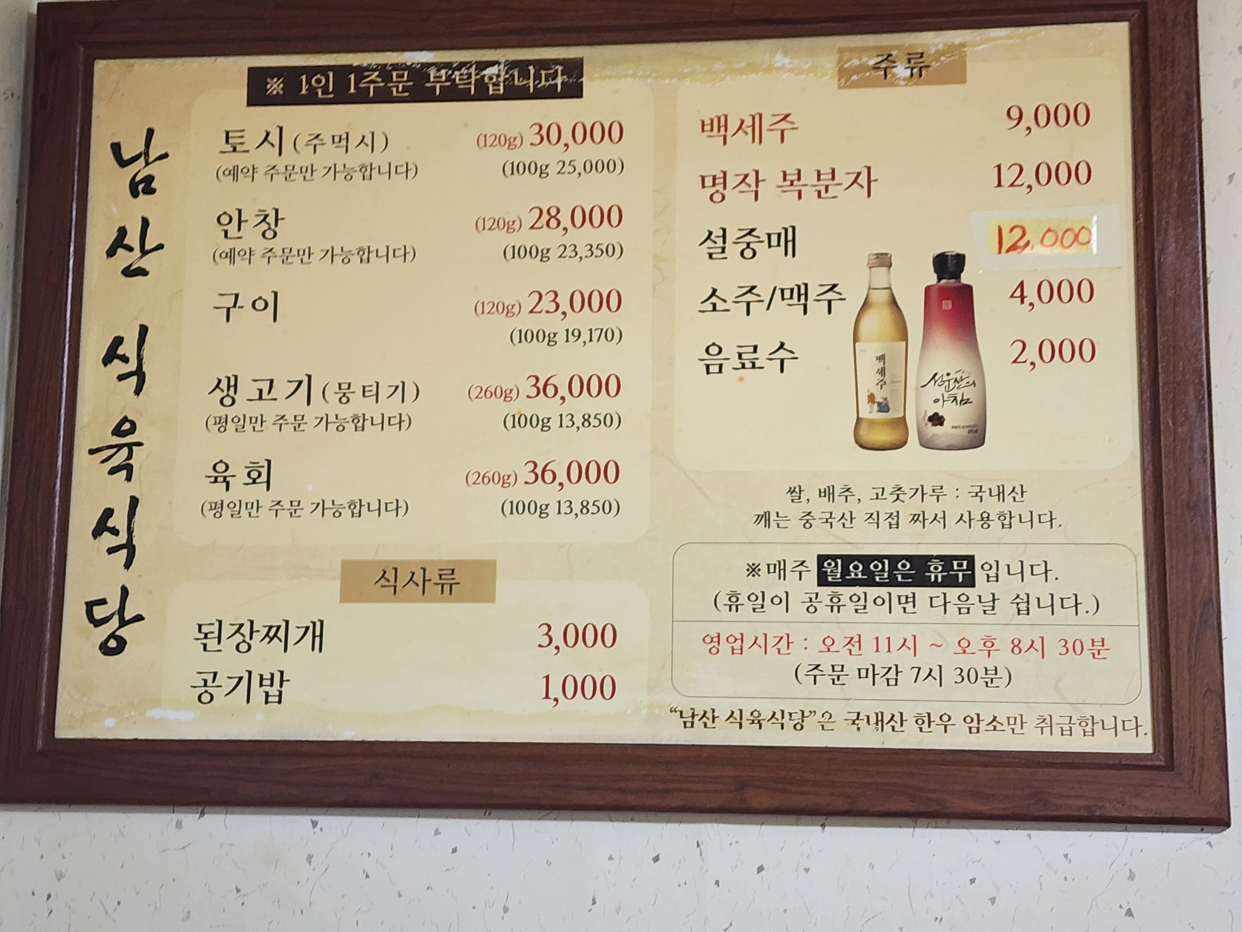 이 식당은 예약이 불가능하며, 방문 대기하여야 한다. 남산식육식당에서는 소고기를 따로 구매할 수도 있다.