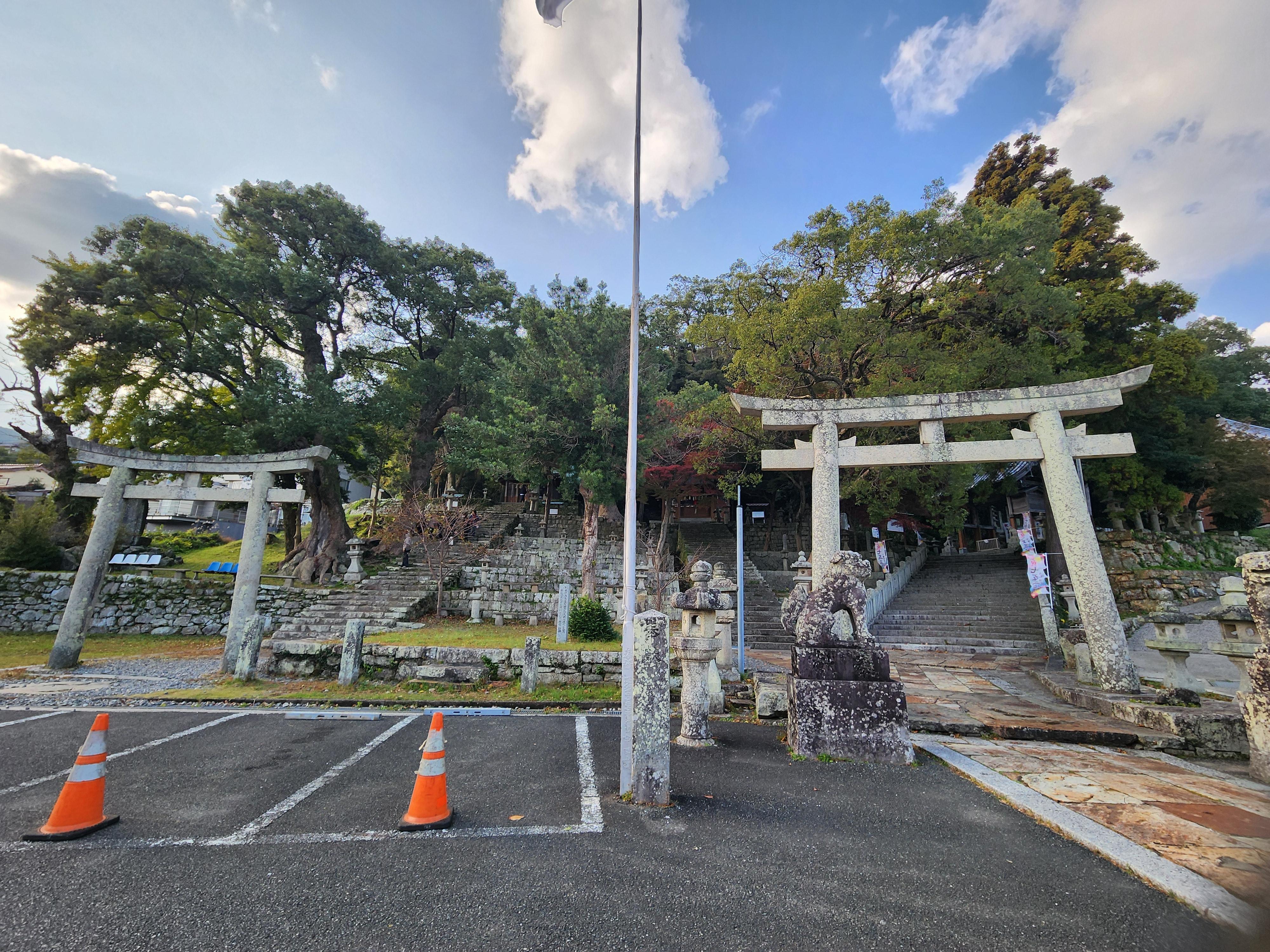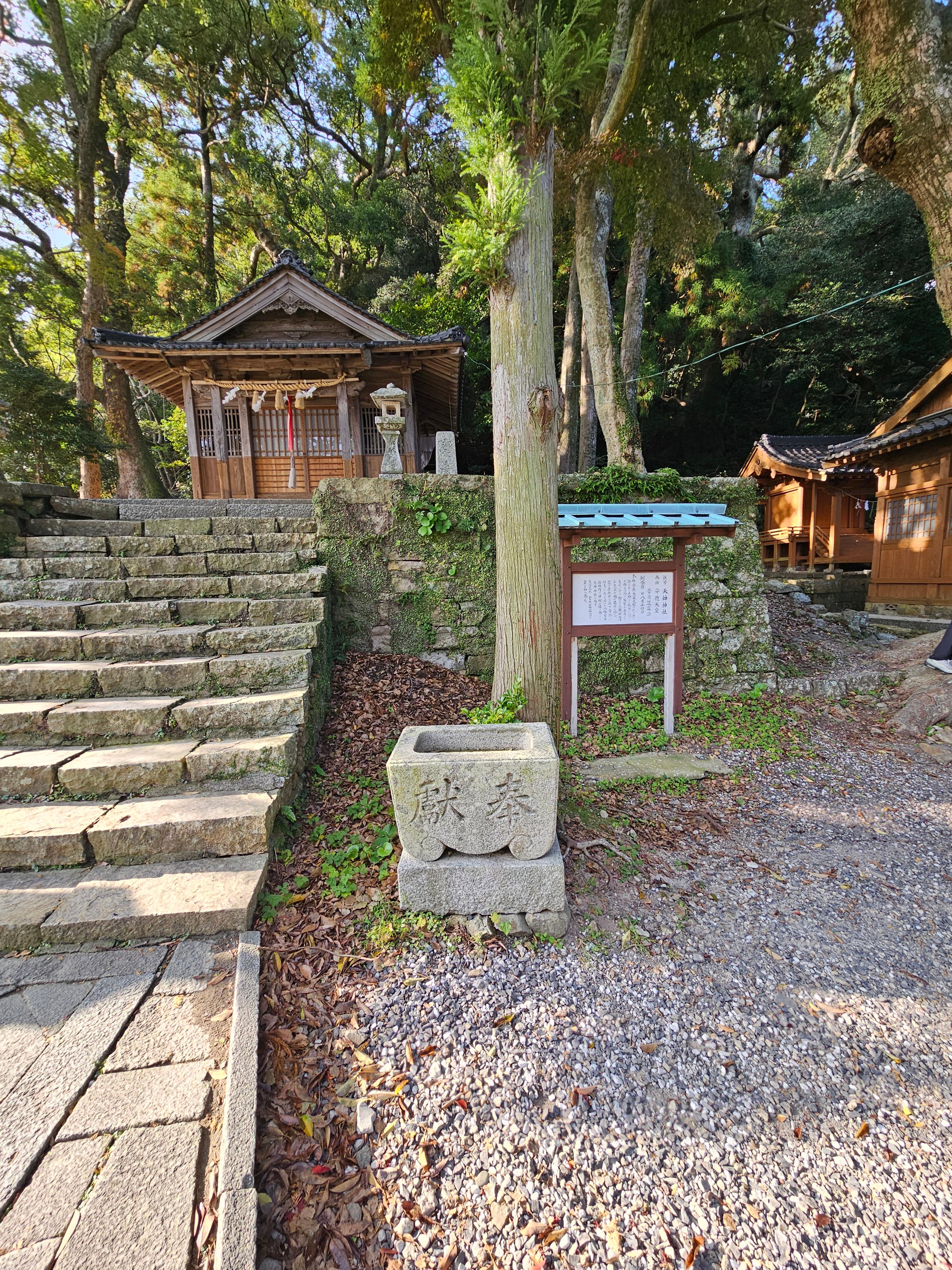 이곳은 러일전쟁의 승리를 기념하는 포탄들이 유물로 남아 있고, 태평양전쟁 전몰자 추모비도 세워져 있는 고대부터 근대까지 일본의 침략 전쟁을 기념하는 유적지라고 볼 수 있는 유쾌하지 않은 장소다. 거대한 '도리이'가 우뚝 서있는 이즈하라에서 가장 큰 규모를 자랑하는 신사다.