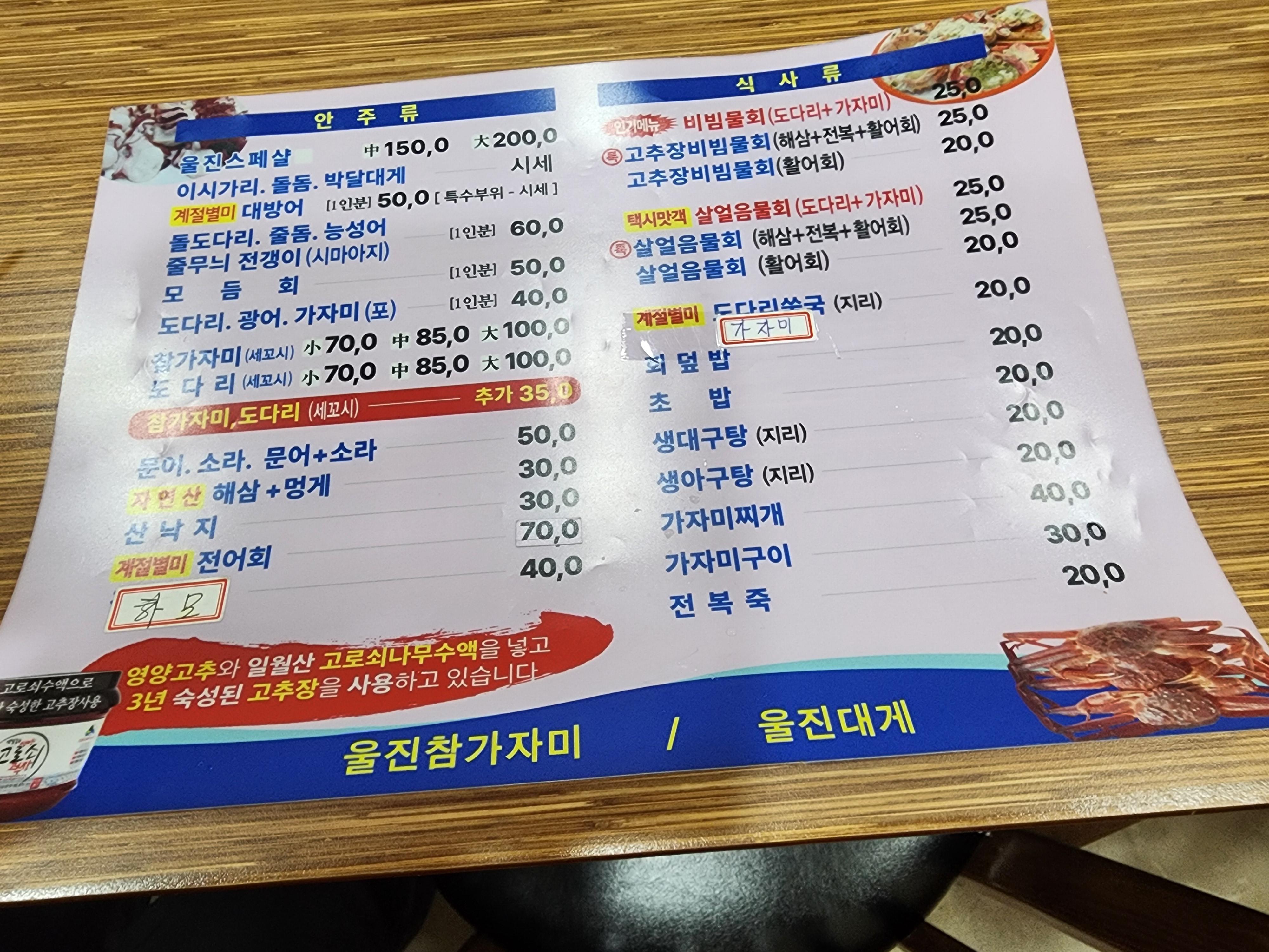 ▣ 메뉴(2025.10); 울진 스페셜 ;중 15만 원, 대 20만 원, 돌도다리, 줄돔, 참도다리 등 1인분 6만 원, 모둠회 1인당 5만 원, 도다리와 광어 1인당 4만 원, 문어와 소라 5만 원, 해삼+멍게 3만 원, 산 낙지 3만 원/ 식사류; 고추장비빔물회(도다리+가자미) 1인분 2.5만 원, 고추장비빔물회(해산+전복+활어회) 2.5만 원, 살얼음물회(도다리+가자미회) 2.5만 원 회덮밥과 초밥 2만 원 등/ 과거에 비해 요금이 많이 올랐다.
