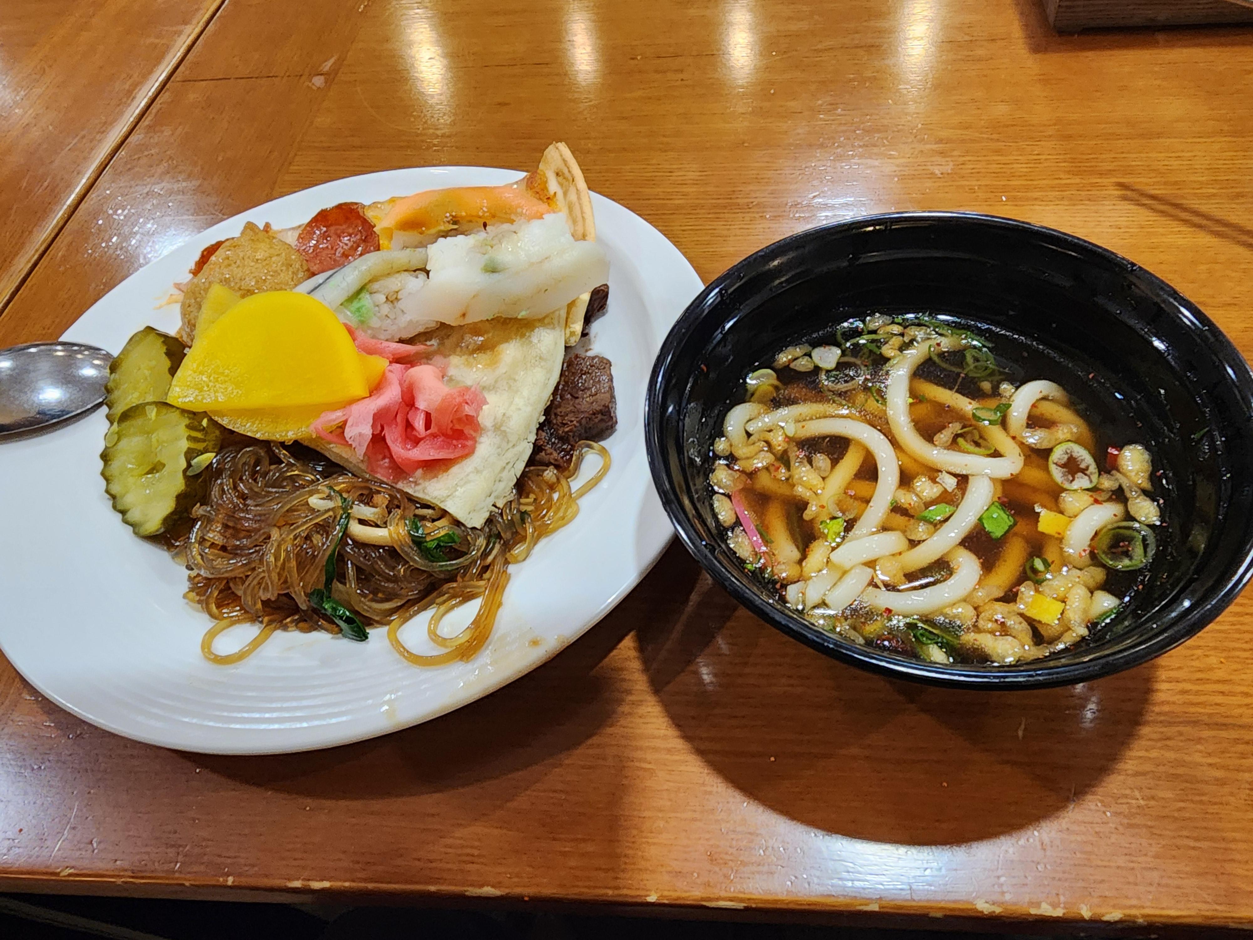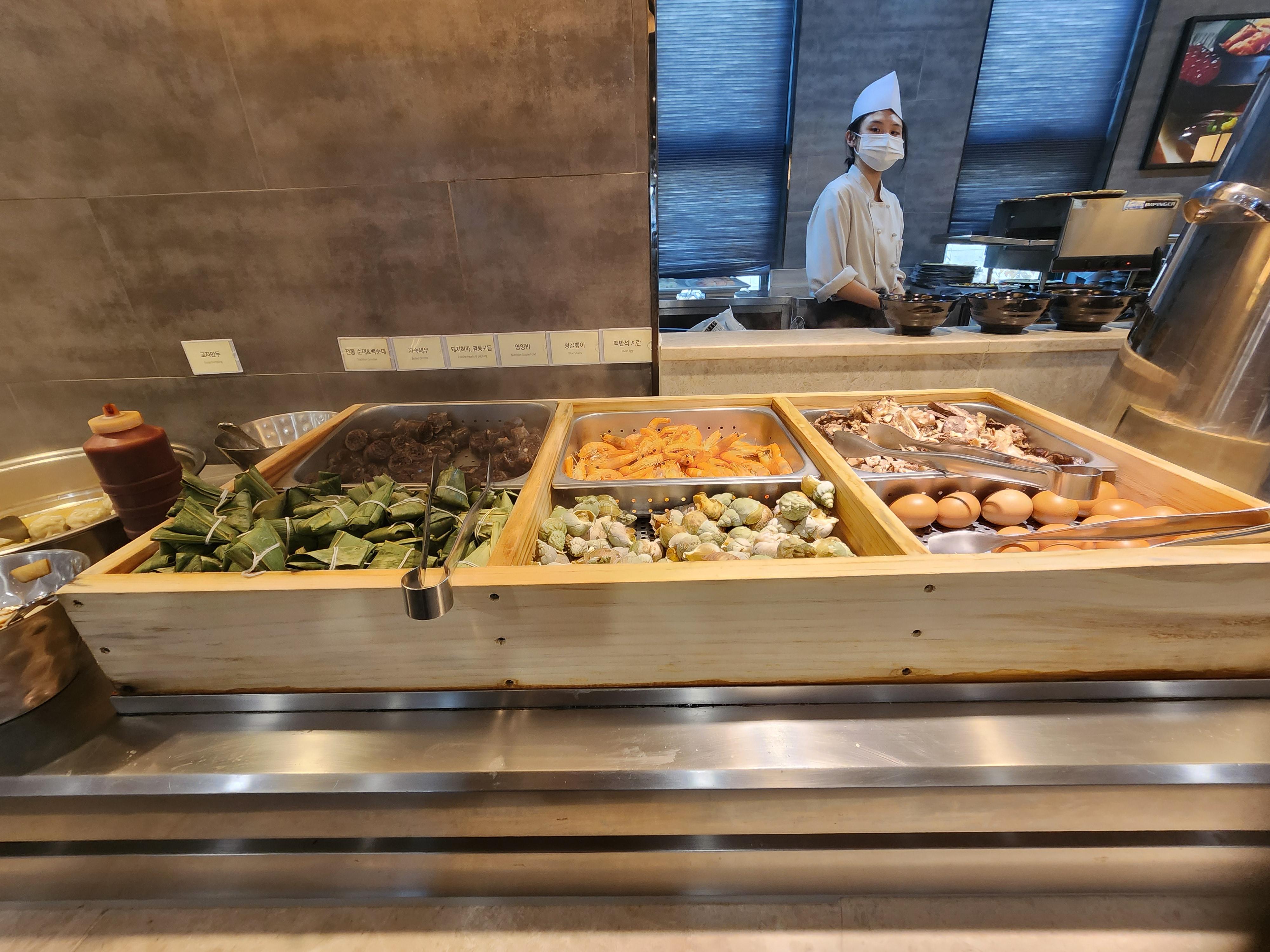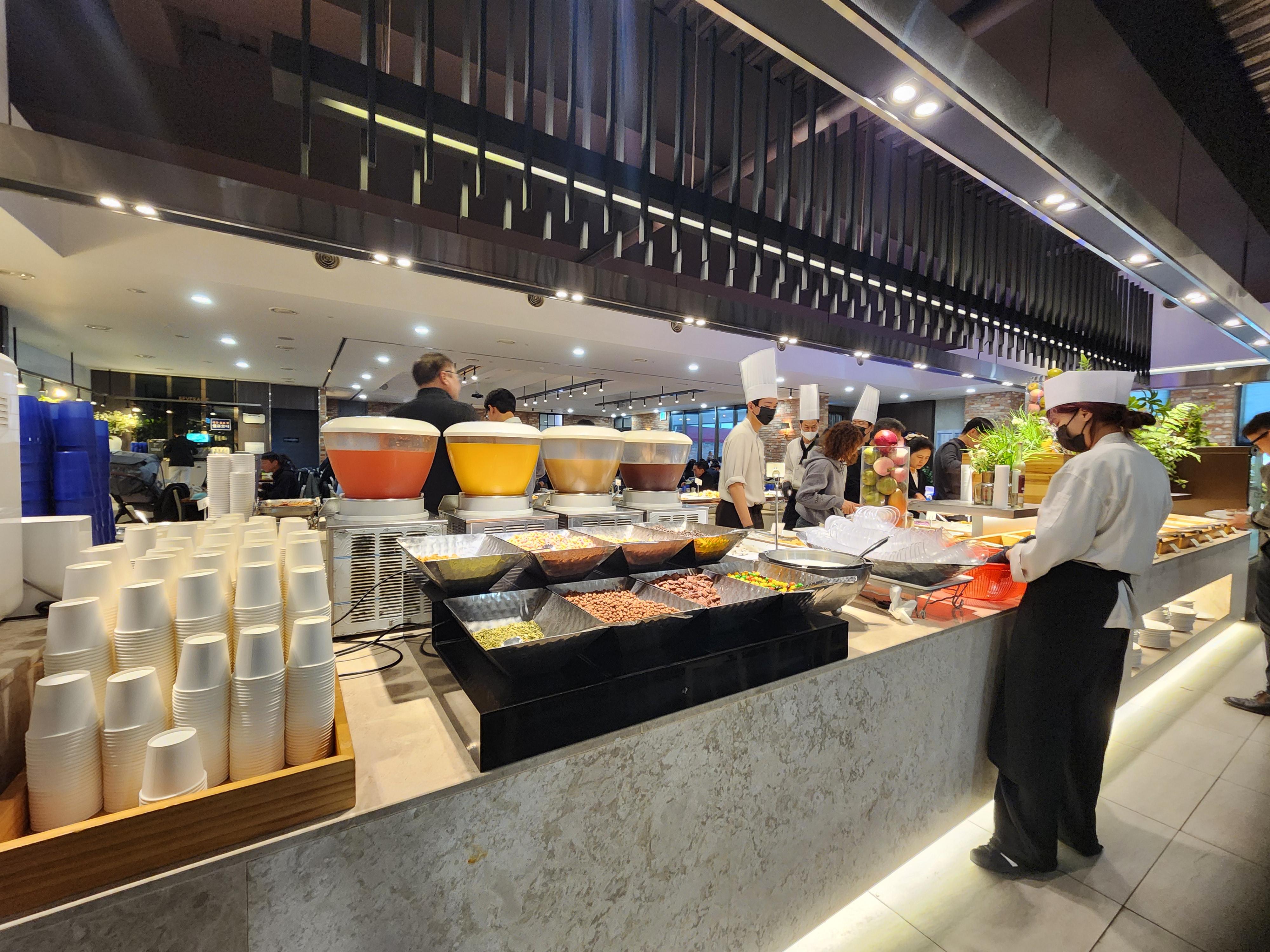 음식 내용과 종류 모두 만족하는 수준이었다. 샐러드류는 종류도 다양했고, 야채도 신선하고 드레싱도 과하지 않아 맛 있었다. 스시와 캘리포니아롤, 회 종류; 학꽁치, 초보리멸,초연어,초장어 스시, 유부초밥, 김밥, 스시 종류도 다양했다. 국수와 우동, 스파게티 면류, 피자 등도 다양하게 있었다.