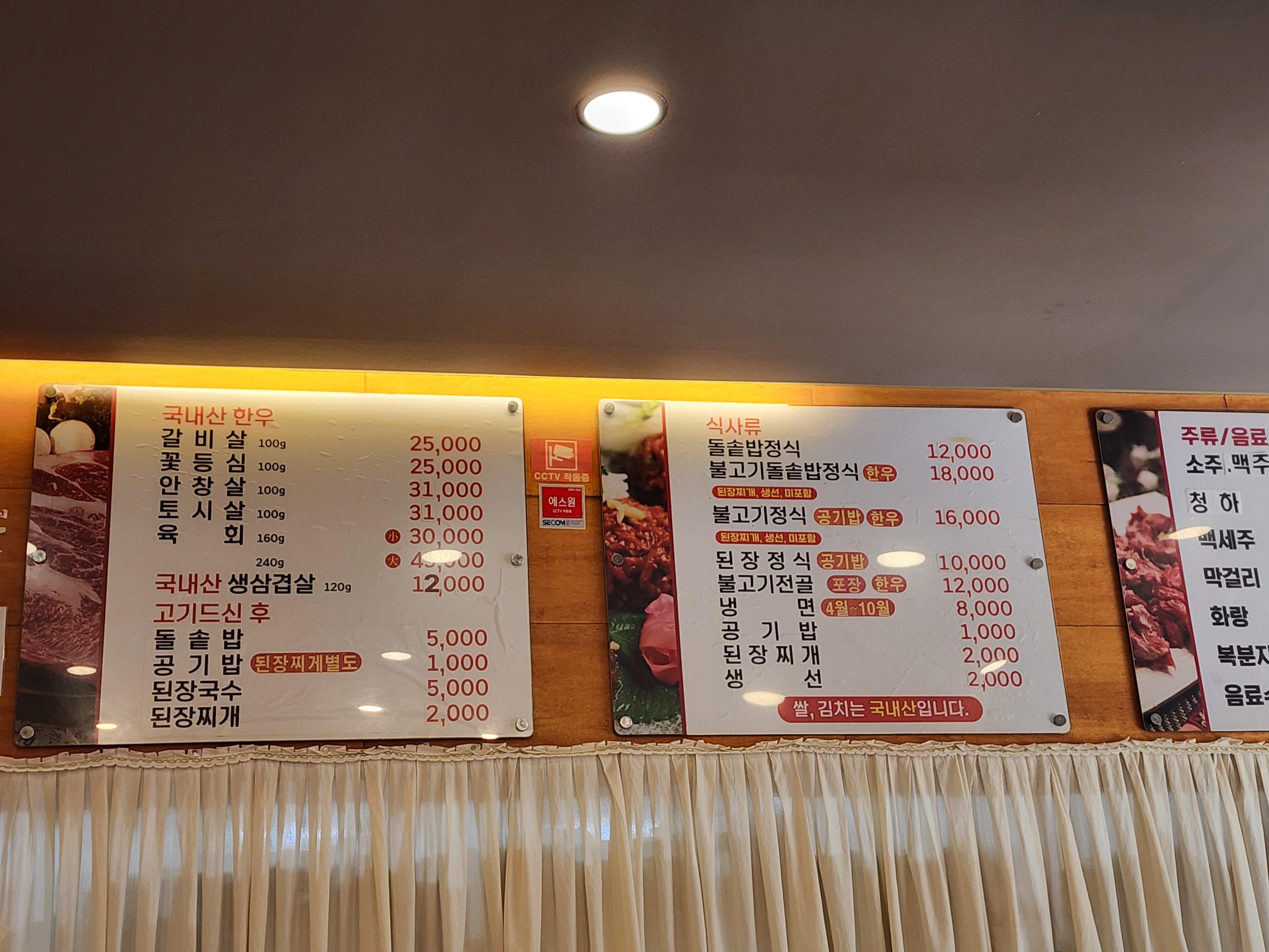 ▣ 메뉴(2026.1); 갈비살(120g) 25,000원, 꽃등심(120g) 25,000원, 육회 30,000원/40,000원, 안창살(120g) 31,000원, 한우불고기정식 18,000원, 돌솥밥정식 12,000원