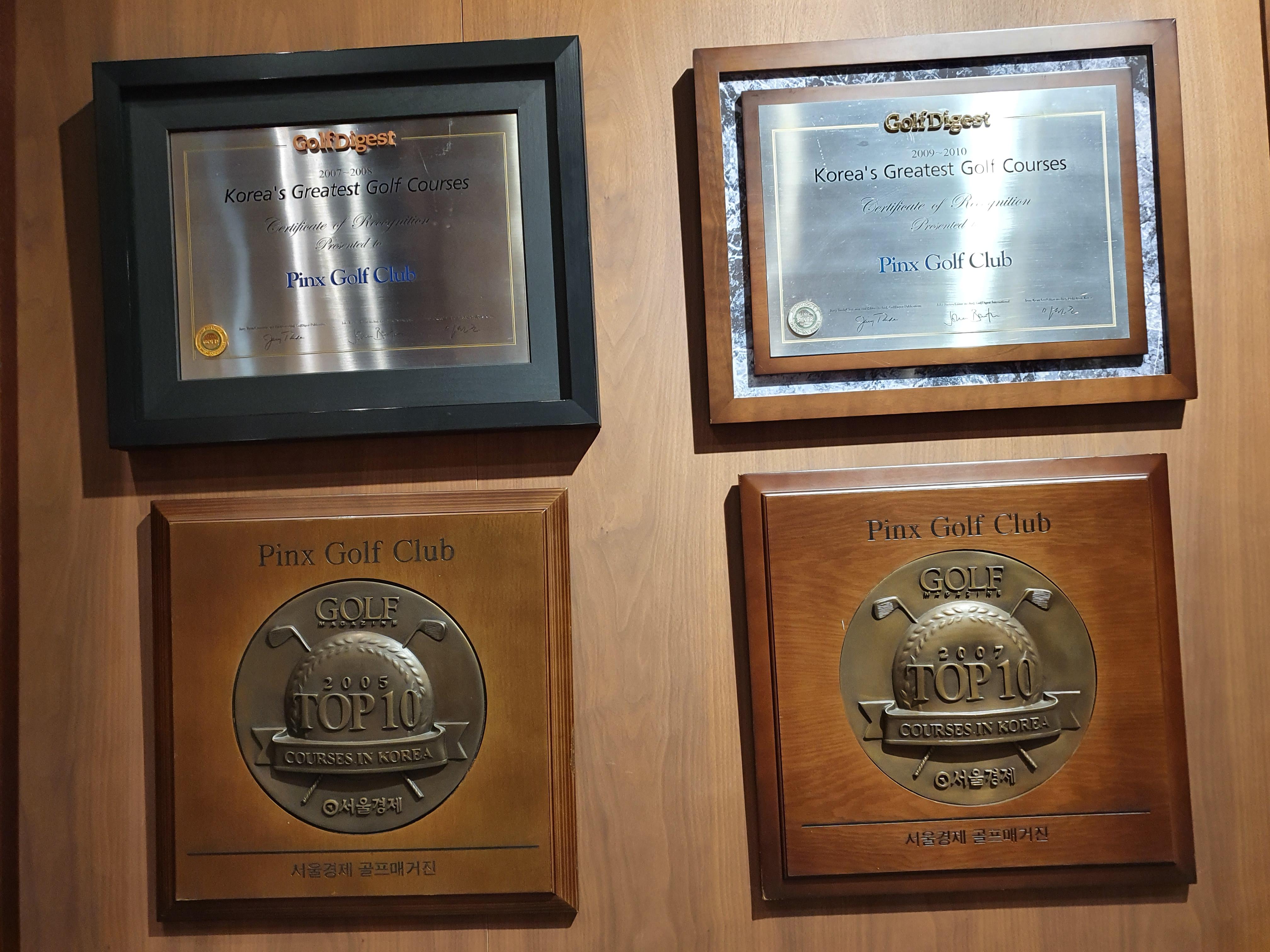 홈페이지에 들어가서 보니 2021년 서울경제 선정 한국 10대코스 1위, 2020년 세계적인 권위를 자랑하는 월드 골프어워드에서 2016년과 2018년 2020년 한국 베스트골프코스로 선정되었다. 2019년에는 서울경제 선정 한국 10대 코스 2위로 선정되었다. 이들은 1층 프런트 벽면에 모두 진열되어 있다.