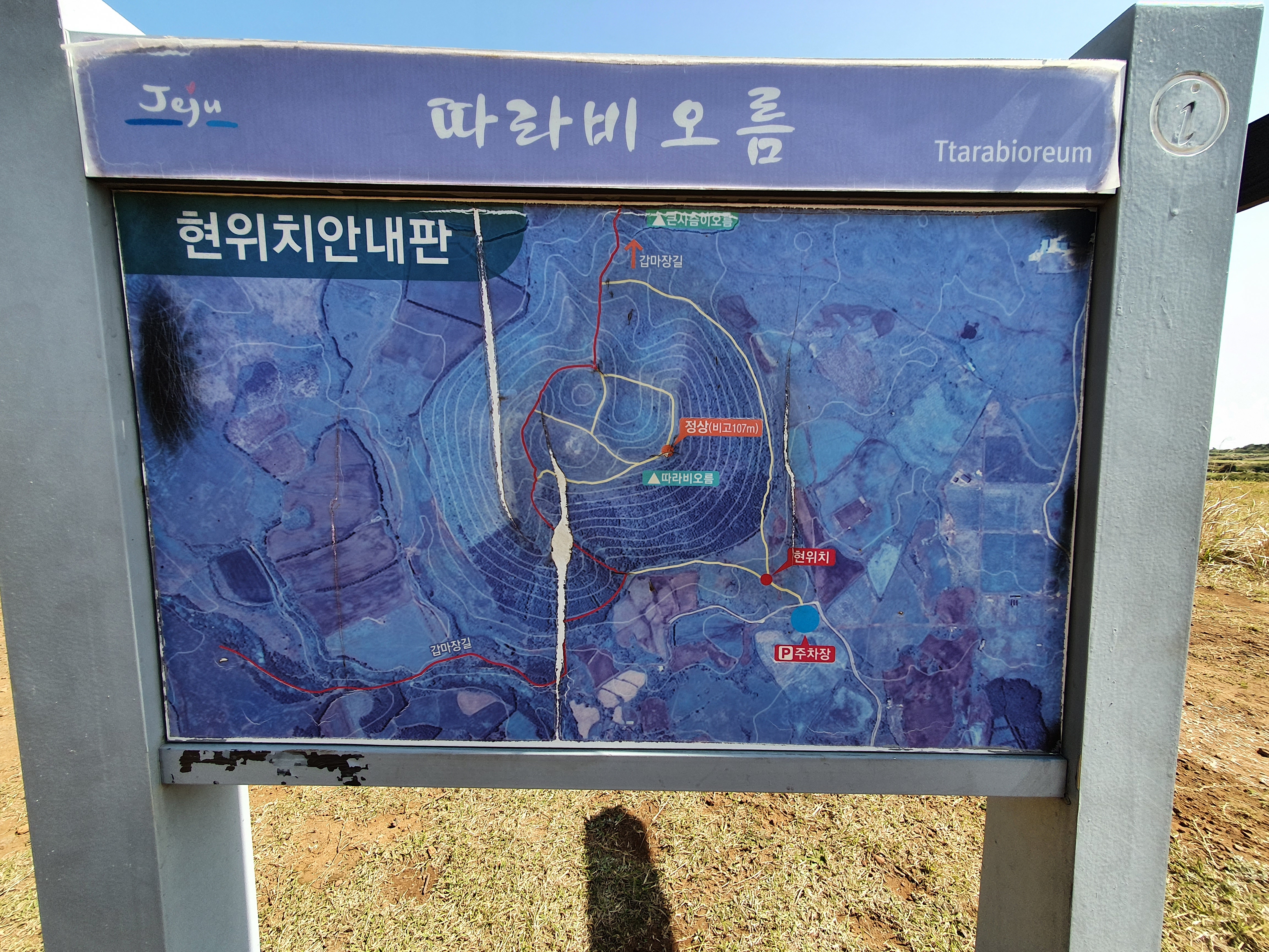 따라비오름은 표고 342m, 비고 107m이다. 억새는 입구 초입부터 화려함을 뽐낸다. 넓은 평원은 바람에 흐드러진 억새로 채워지고 그 사이로 아늑한 오솔길이 놓였다. 최고의 인생샷을 남기기 위해 사람들은 빼꼼히 얼굴을 내민 채 억새 숲에 몸을 숨기기도 한다.
