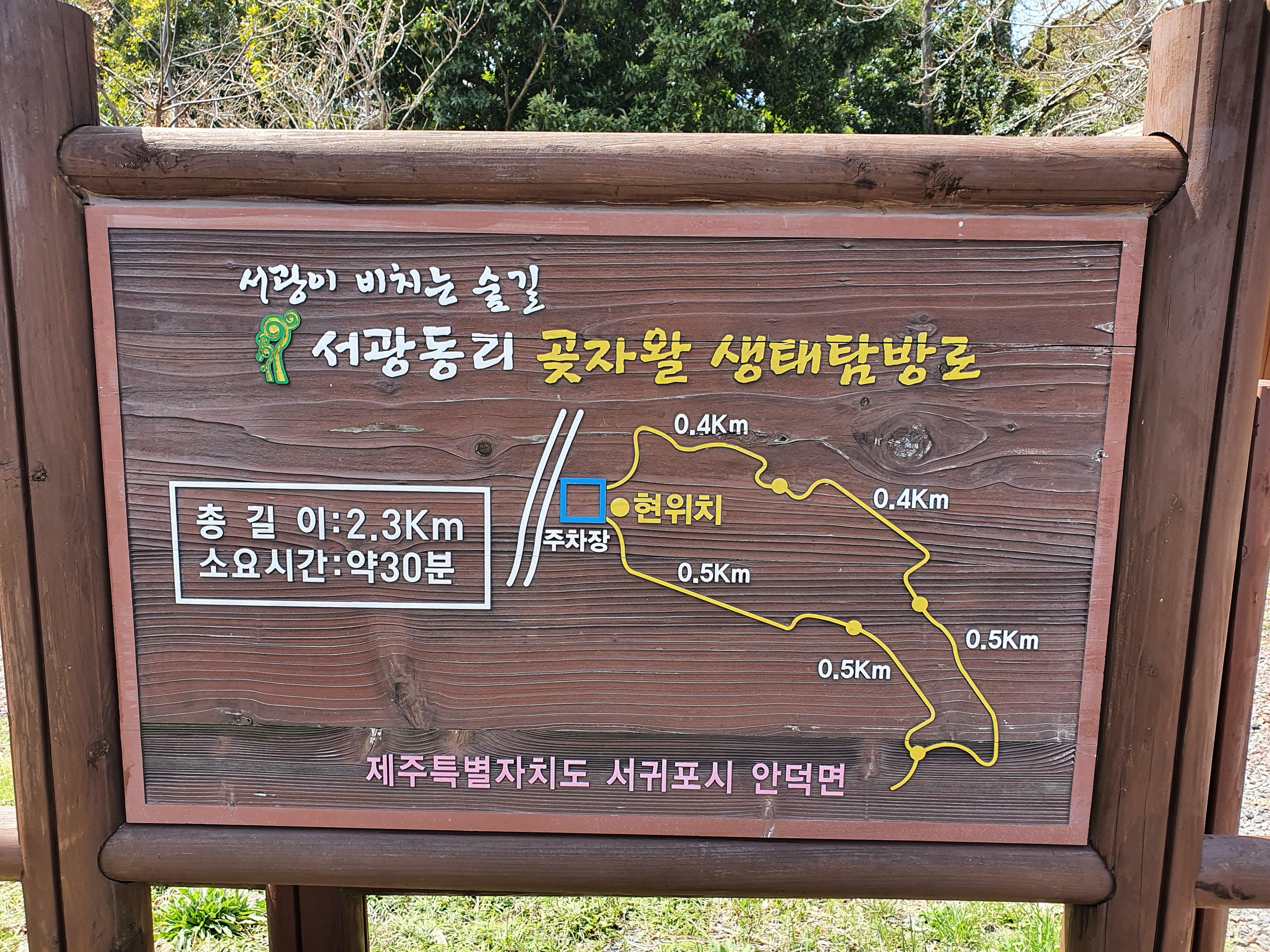 제주도에는 한림, 안덕에는 제주곶자왈도립공원(이춘근의 경제상식과 여행정보 349회차)이 있고, 또 화순에는 곶자왈 생태탐방 숲길(이춘근의 경제상식과 여행정보 370-371회차)이 있으며, 안덕면 서광동리에는 서광동리 생태탐방 숲길이 있다. 이번에는 서광동리 생태탐방로에 대해서 설명한다.