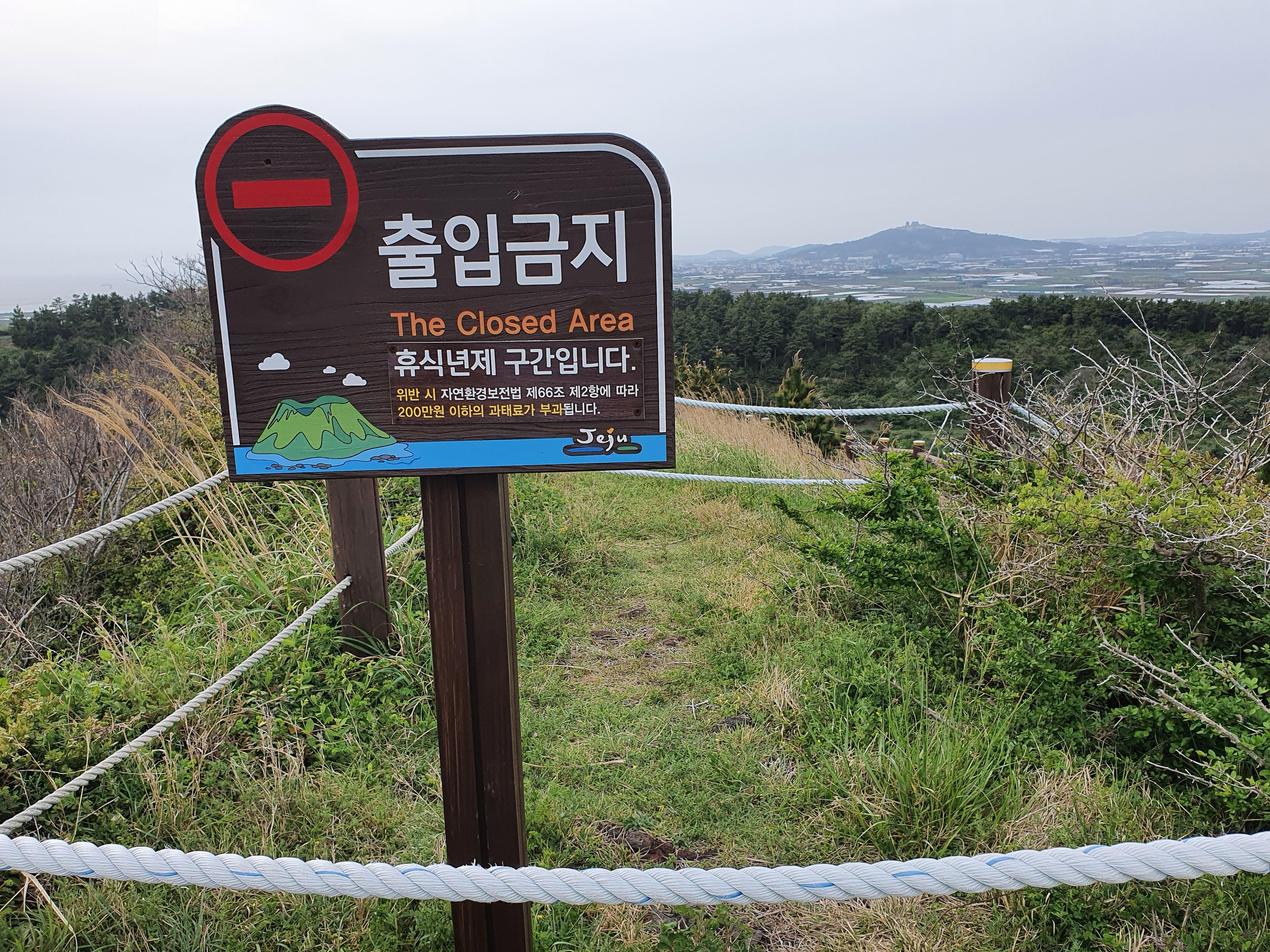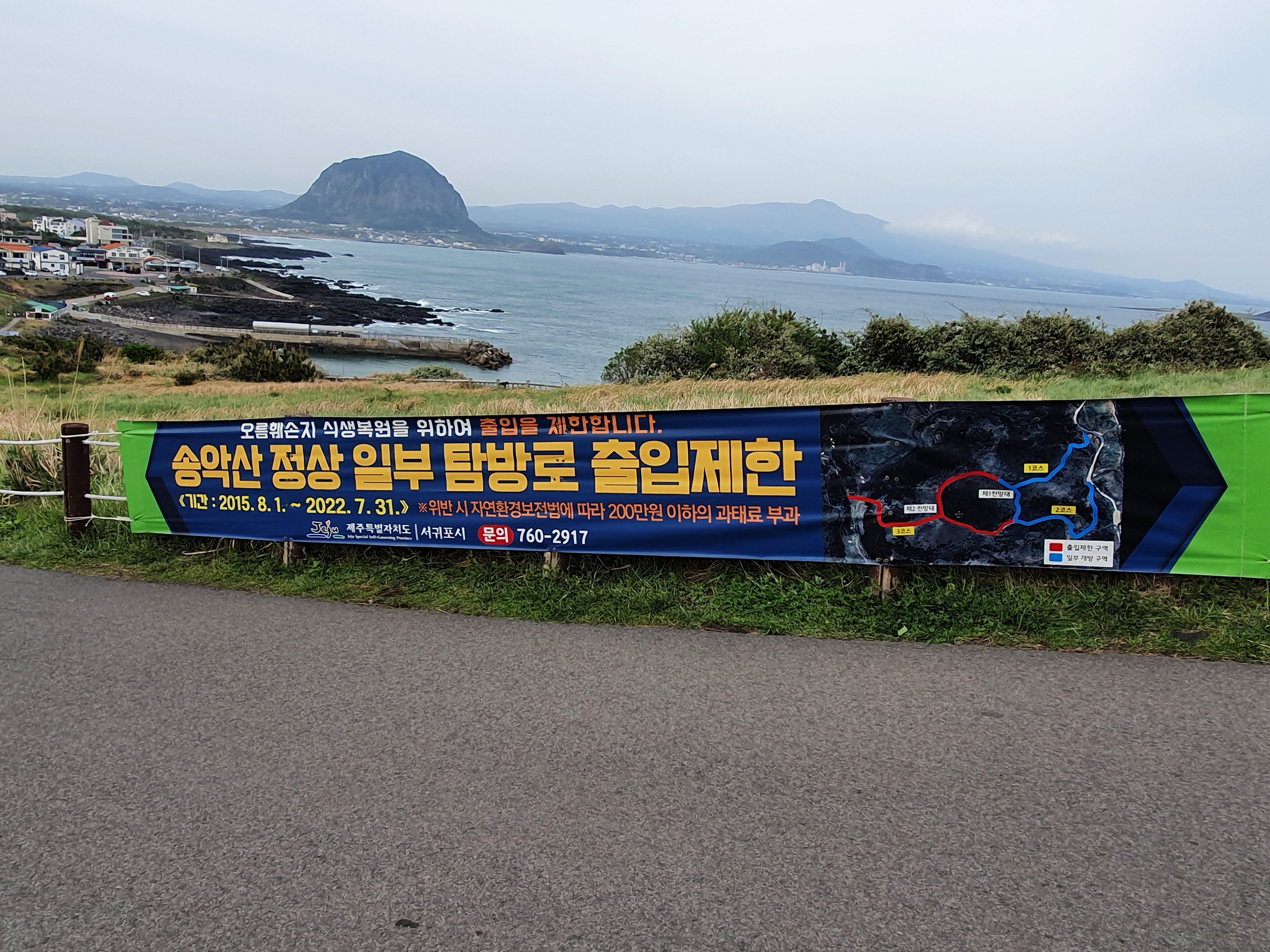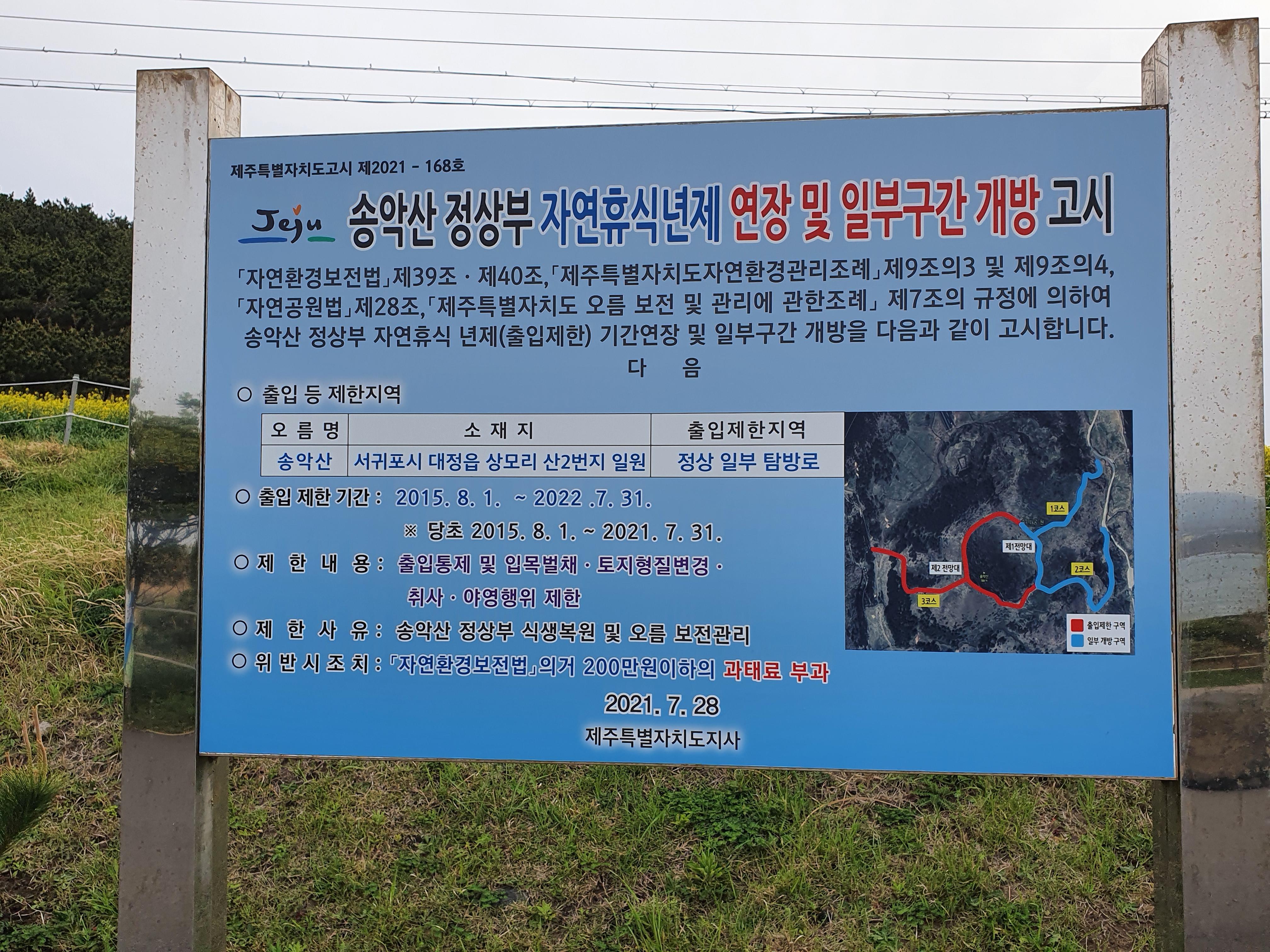 몇 년 전부터 매년 연말에 안덕면에 살아서 세 번 정도 송악산 둘레길을 돌았었다. 그러나 정상부는 개방하지 않아 올라가지 못했다. 2022년 4월 초 시간이 있어 다시 산책하러 갔었는데, 마침 정상코스 일부를 개방하여 갔다 왔다. 송악산 일부 구간과 정상부는 지난 7년간 자연회복을 위해 자연휴식년제에 들어갔었다. 입구에 게시판을 보니 정상 일부 탐방로를 개방하지 않고, 자연휴식년제를 연장하고 있었다. 그래서 금년 7월말까지는 전체 둘레길을 모두 돌 수는 없다. 송악산 둘레길이나 정상에서는 가파도와 마라도, 산방산과 형제섬이 잘 보이고, 모슬포항과 대정 앞바다 뷰가 잘 보여 상당히 좋다. 그래서 많은 사람들이 자주 찾는 곳이다..