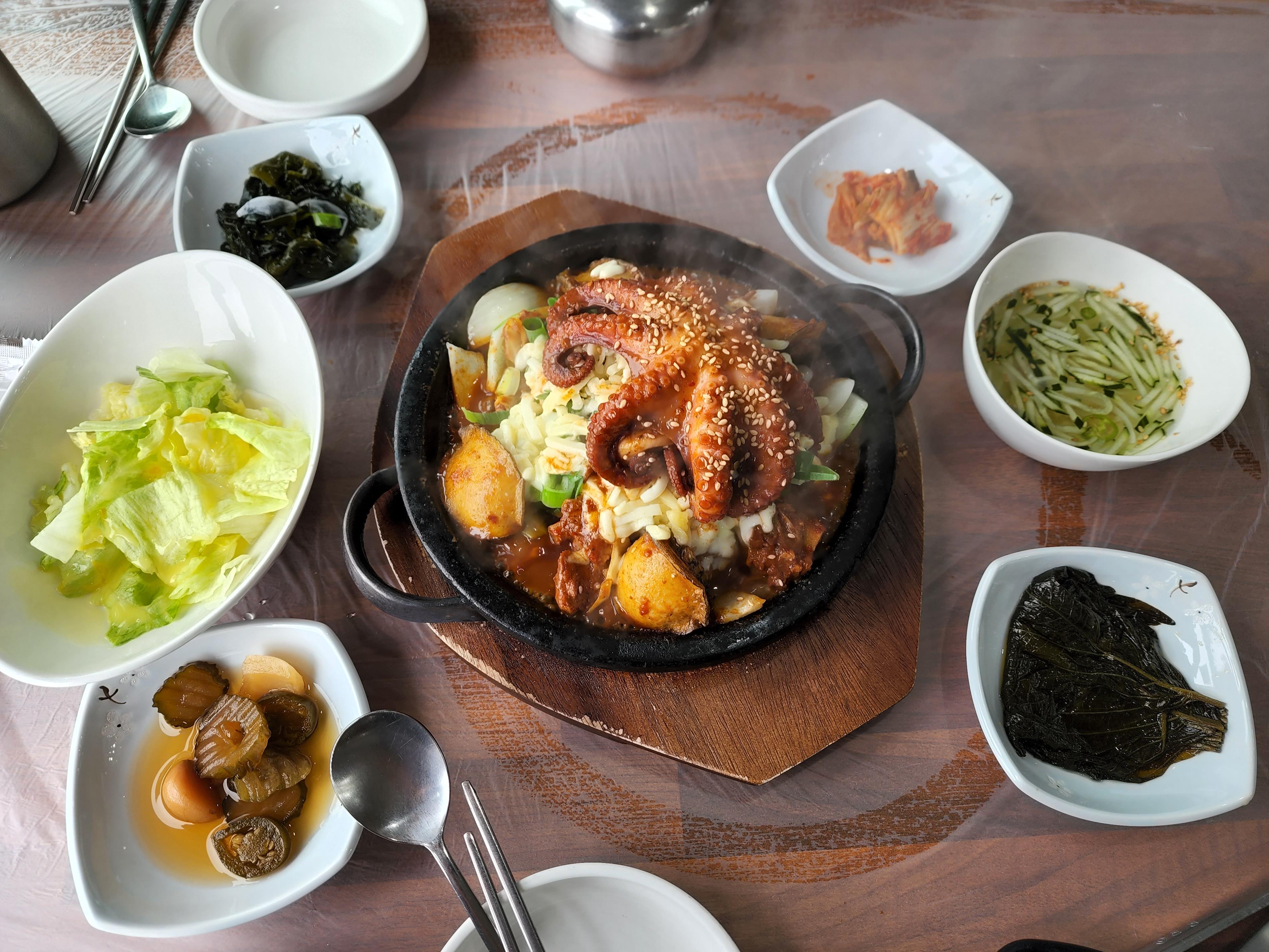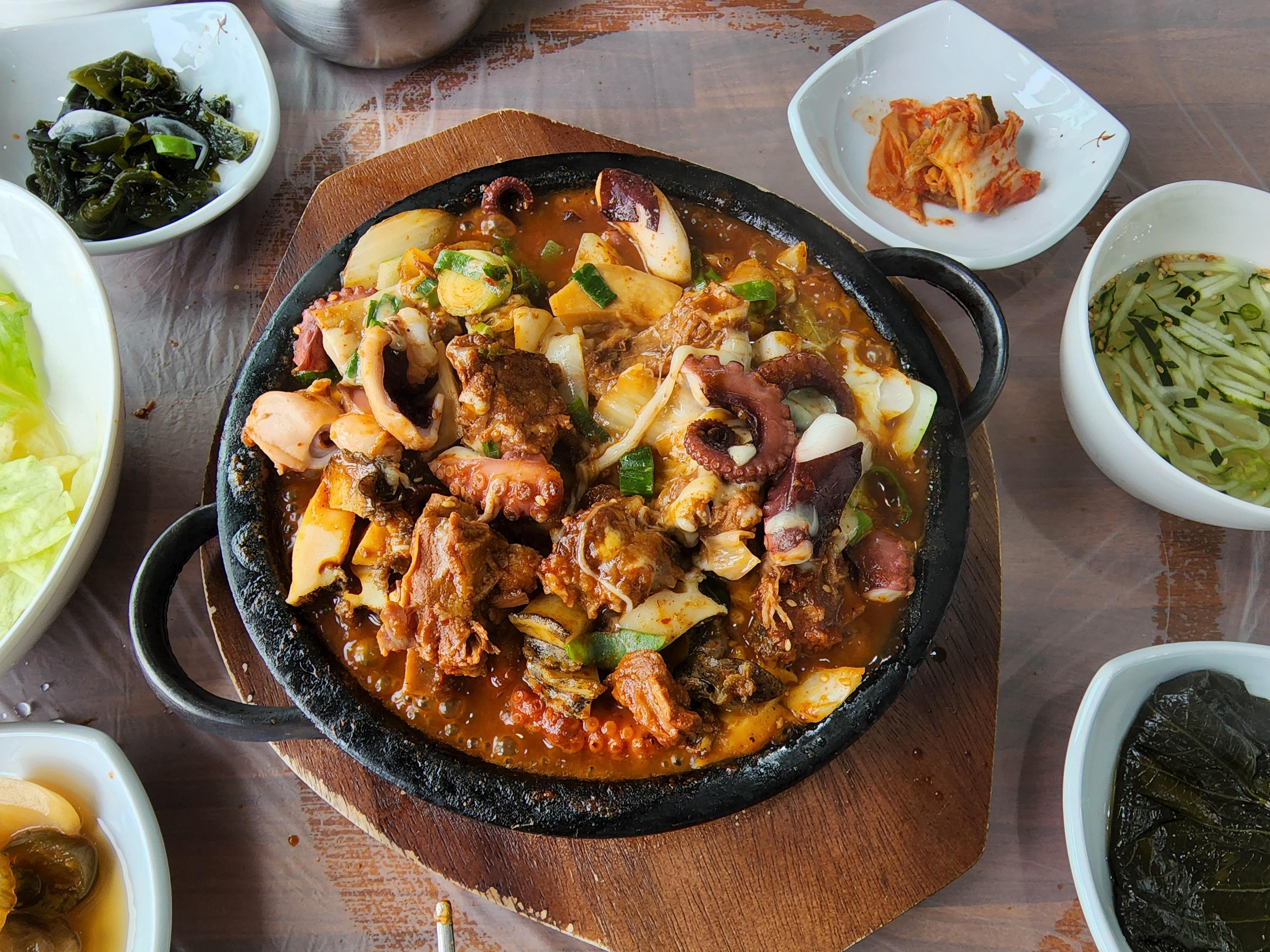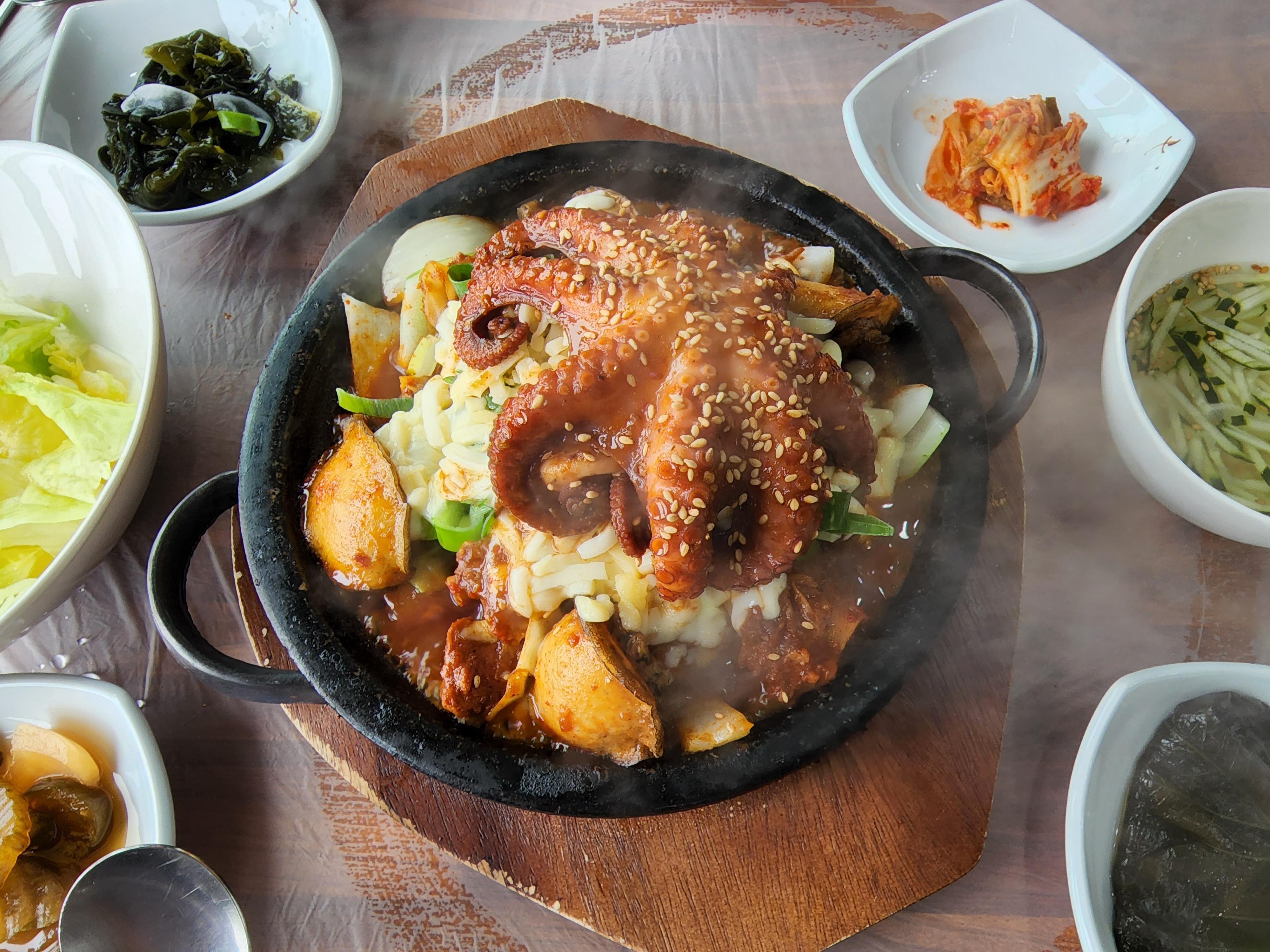 산방산 앞 바다 뷰가 잘 보이는 깔끔한 분위기의 식당이다. 제왕삼합볶음 메뉴가 인기있는데, 전복, 문어, 흑돼지가 들어가서 삼합이다. 그 밖에 다양한 재료가 들어가서 맛을 더해주며 매콤해서 자꾸 먹고 싶은 맛이다.