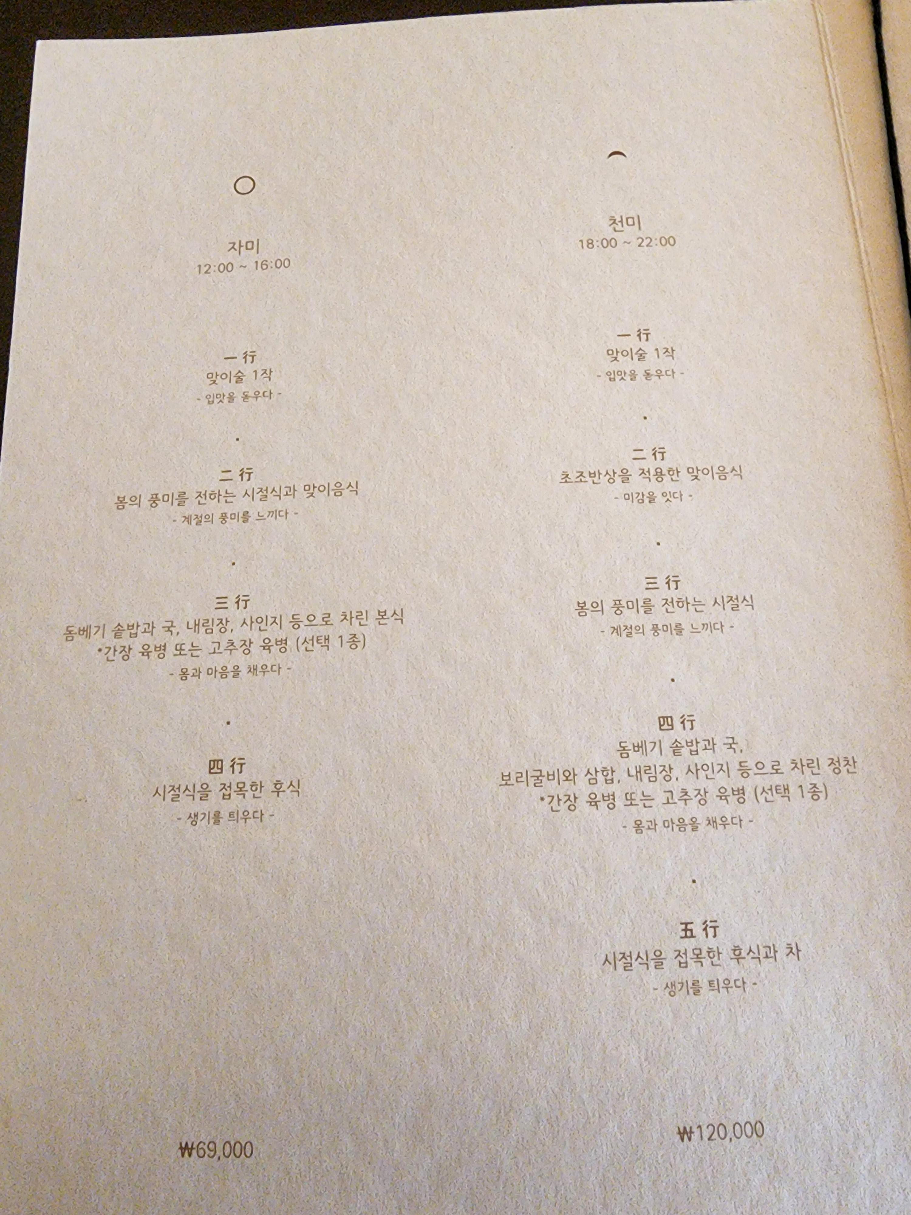 ▣ 단일 메뉴만 있다; 점심; 자미(滋味) 6만 9천원. 저녁; 천미(天味) 12만원