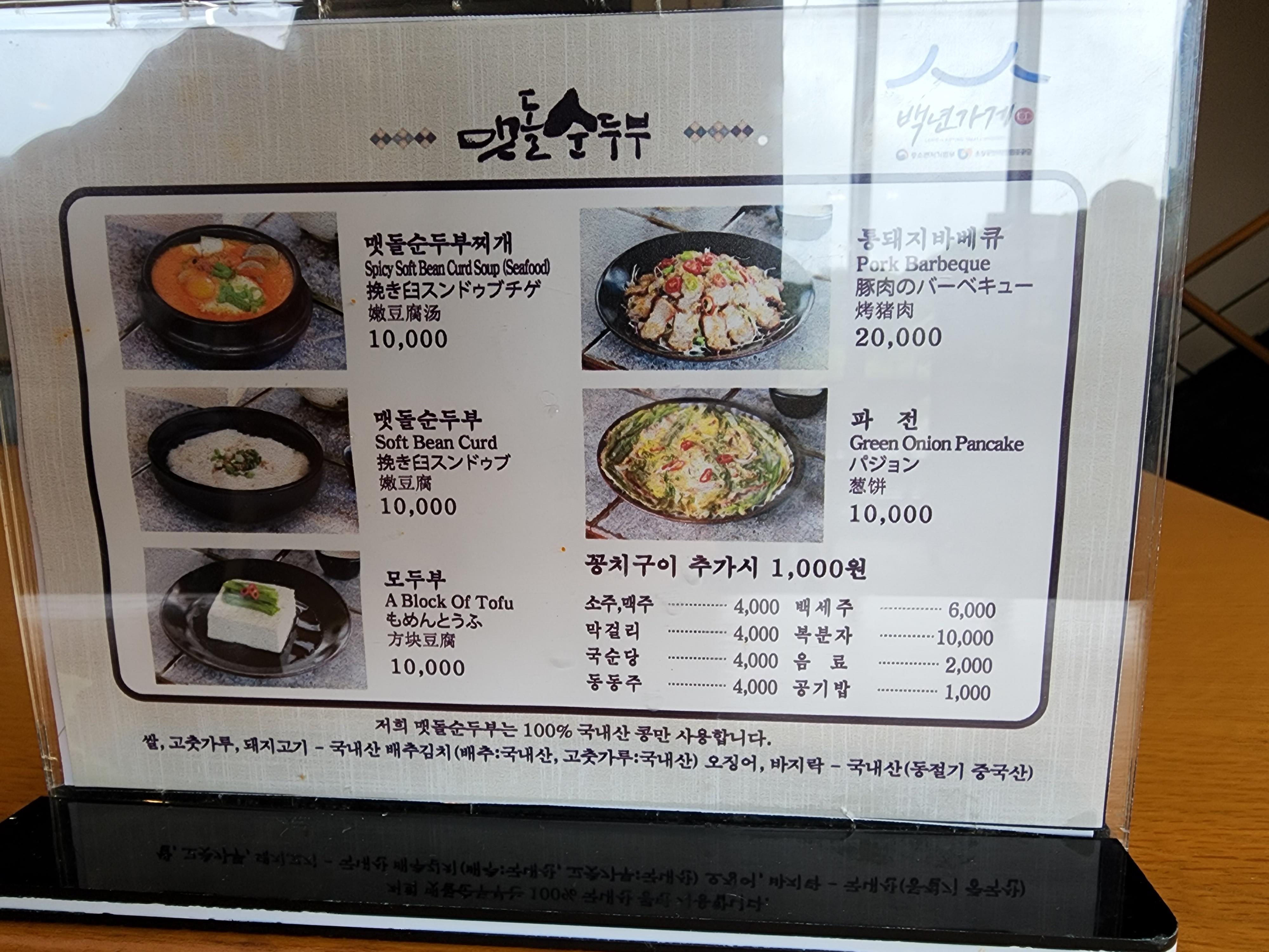 ▣ 메뉴(2022.7); 맷돌순두부찌개 1만원, 맷돌순두부 1만원, 모두부 1만원, 파전 1만원, 통돼지 바베큐 2만원