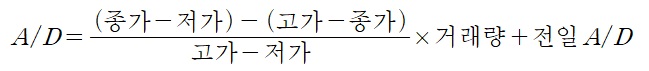 당일의 종가에서 당일 주가 움직임의 중간치를 뺀 값과 당일의 고가에서 저가를 뺀 값의 비율이 Chaikin의 AD이다. 수식으로 표시하면 다음과 같다. A/D는 가격과 거래량의 변화를 포함한 모멘텀 지표다. 이 지표는 가격 움직임에 동반되는 거래량이 많을수록 가격의 움직임이 더 커진다는 전제에 근거한다. Accmulation/Distribution은 일정한 기준에 의해 가감된 거래량을 누적하여 계산되는 지표로서 마크 차이킨 (Marc Chaikin)이 OBV를 개량하여 만든 것이다.