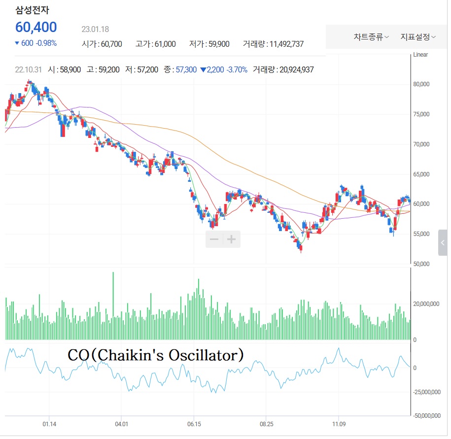 CO(Chaikin's Oscillator)= AD의 3일 단순이동평균 - AD의 10일 단순이동평균