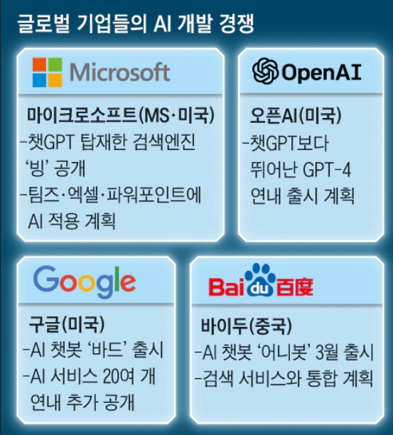 중국 최대 검색 업체 바이두도 챗GPT와 유사한 AI 챗봇을 3월에 출시한다고 밝혔고, 러시아의 얀덱스도 챗봇 ‘YaLM 2.0′ 개발에 나섰다. 한국 업체들도 글로벌 AI 전쟁에 참전하고 있다. 네이버는 한국판 챗GPT인 ‘서치GPT’를 상반기 출시할 계획이고, 카카오는 자체 개발한 ‘KoGPT’를 접목한 대화형 AI를 올해 안에 선보일 예정이다.