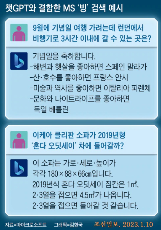 포문을 연 곳은 미국의 마이크로소프트(MS)다. 마이크로소프트는 7일(현지 시각) 미 워싱턴주 레드먼드 본사에서 챗GPT를 적용한 인터넷 검색 엔진 ‘빙(bing)’을 공개했다. 사용자가 대화 형식으로 원하는 것을 물으면 빙에 탑재된 AI 챗봇이 자세한 답을 해준다. 검색창에서 직접 일일이 찾지 않아도 된다. 큰 화제를 모았던 챗GPT는 2021년까지의 데이터를 기반으로 주어진 질문에 답을 하지만, 빙은 1시간 전 최신 뉴스까지 반영한다. 사티아 나델라 MS CEO(최고경영자)는 “AI 기반 검색 엔진 출시는 클라우드(가상서버) 서비스가 나오기 시작하던 2007~2008년 이후 가장 큰 사건”이라며 “AI 기술은 우리가 알고 있는 거의 모든 소프트웨어 범주를 재편할 것”이라고 했다. 우리는 빠르게 움직일 것”이라고 했다.