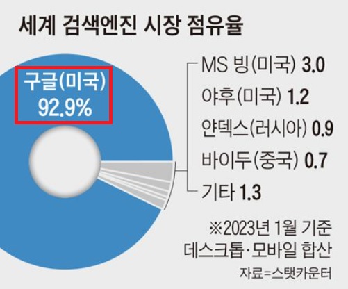 시장조사기관 스탯카운터에 따르면. 올해 1월 기준 글로벌 검색 엔진 시장에서 구글이 차지한 비중은 92.9%다. 그 뒤로 ▲빙 3.03% ▲야후 1.22% ▲얀덱스(YANDEX) 0.85% ▲바이두 0.65% ▲덕덕고 0.58% 순이다.