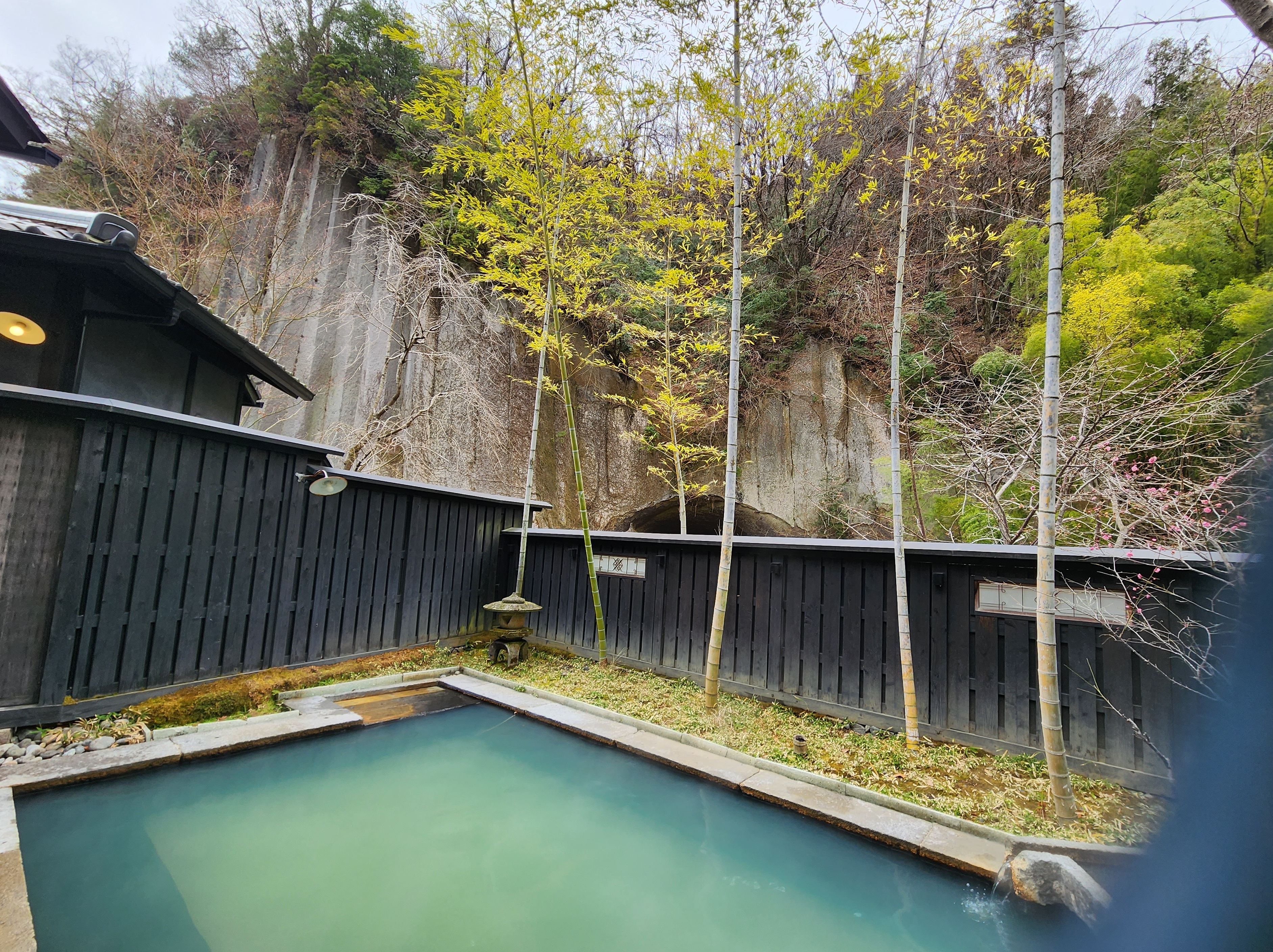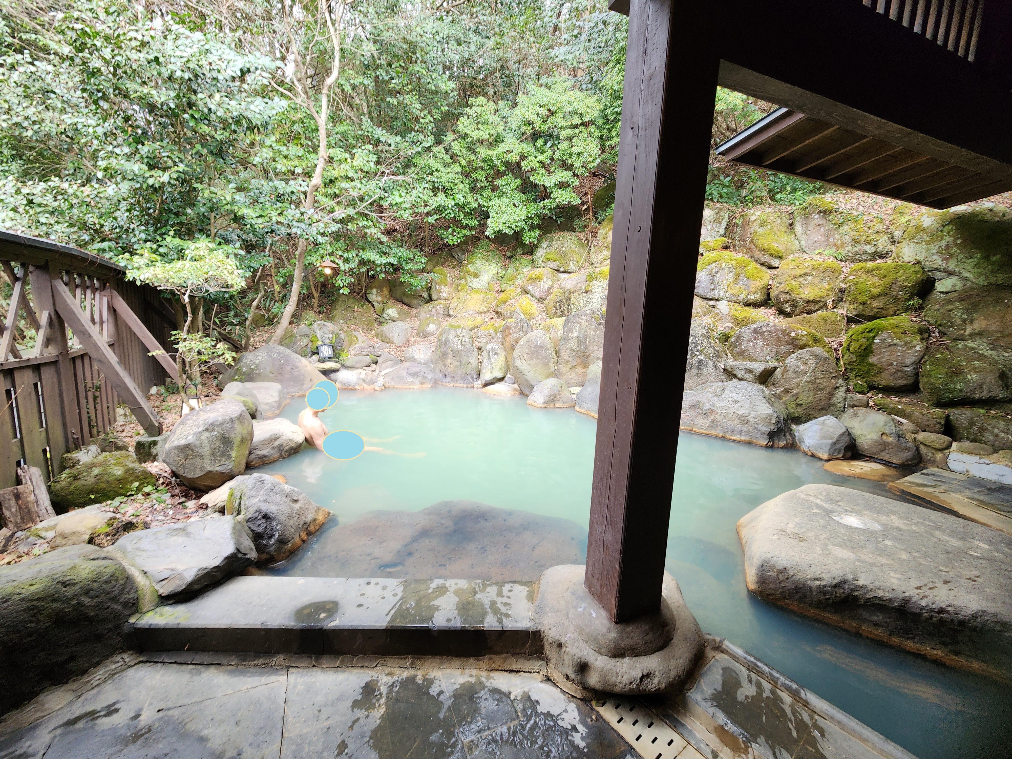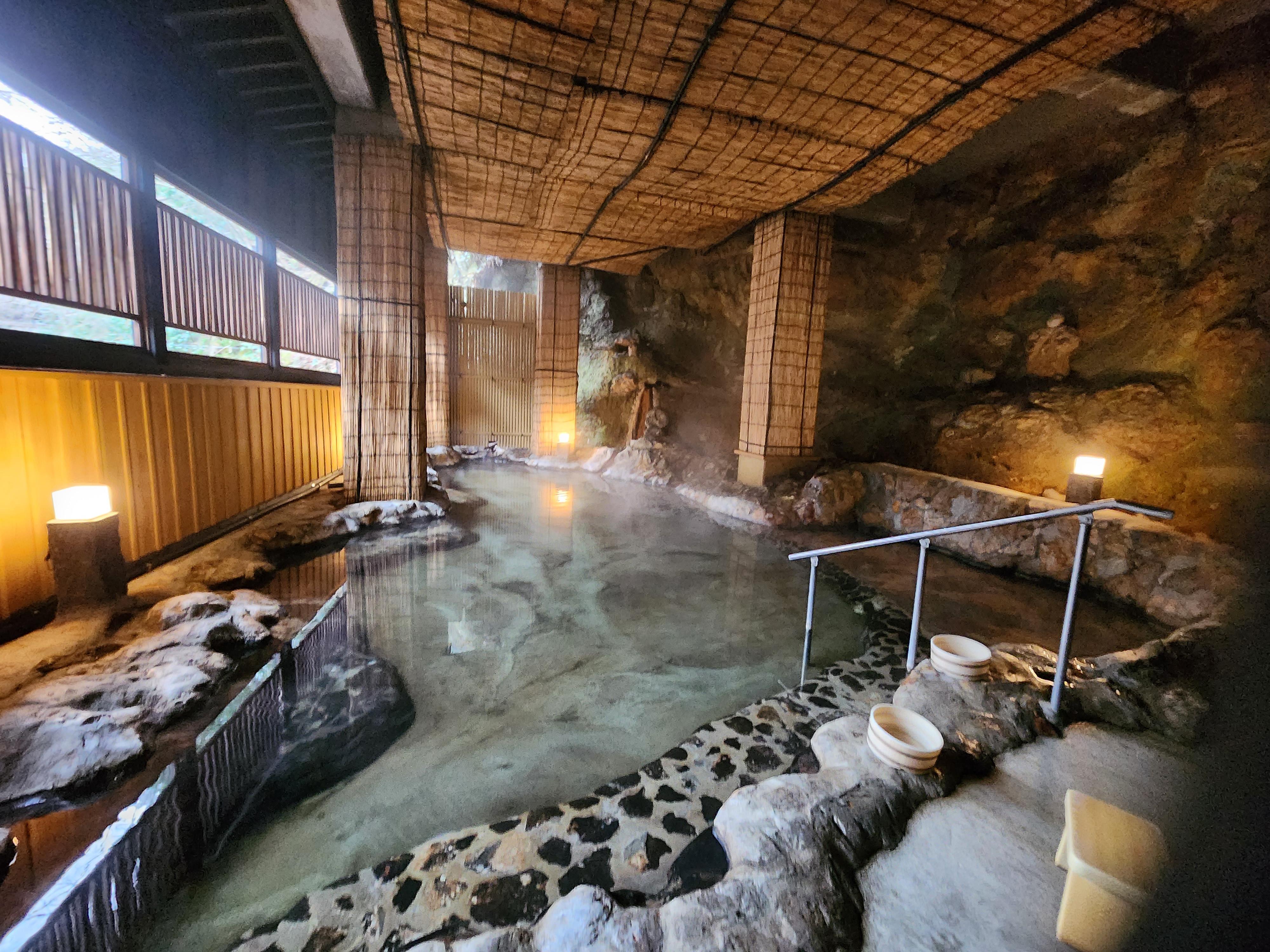 이 료칸에는 투숙객을 위한 실내 욕실에는 저온 사우나도 마련되어 있다. 4개의 대욕장과 노천탕이 늘어서 있어 주변의 자연과 조화를 이룰 수 있다(남녀 교체 시스템). 바람의 속삭임, 나무에 부딪히는 나뭇잎의 바스락거리는 소리, 새소리, 강물소리, 평소 잊어버리는 것을 느끼면서 천천히 몸을 담글 수 있는 목욕탕. 눈앞에 우뚝 솟은 "뵤부 바위"를 바라보면서 분위기 넘치는 가족탕도 3개 있다.