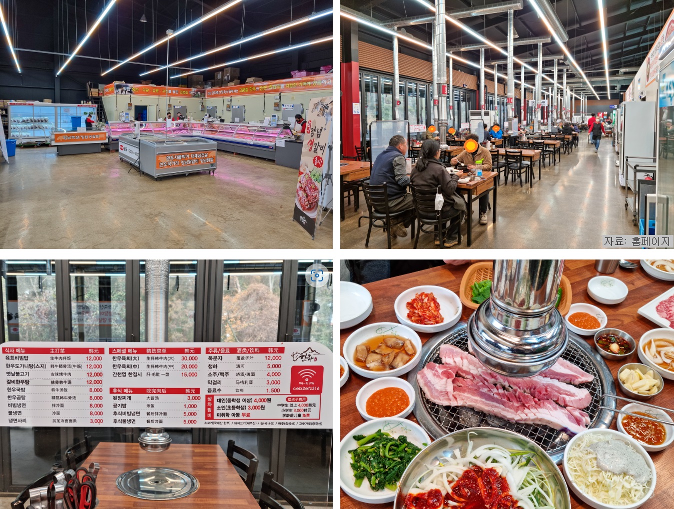 한쪽 건물에 마련된 한라축산도매센터에서는 돼지고기와 소고기를 부위별로 판매하고 있어 취향에 따라 선택해서 구입한 후 식당으로 가져가면 된다. 식당에서는 상차림비와 식사비를 내고 먹으면 된다. 식사는 육회비빔밥과 한우 도가니탕, 된장찌개와 냉면 등이 준비되어 있다.