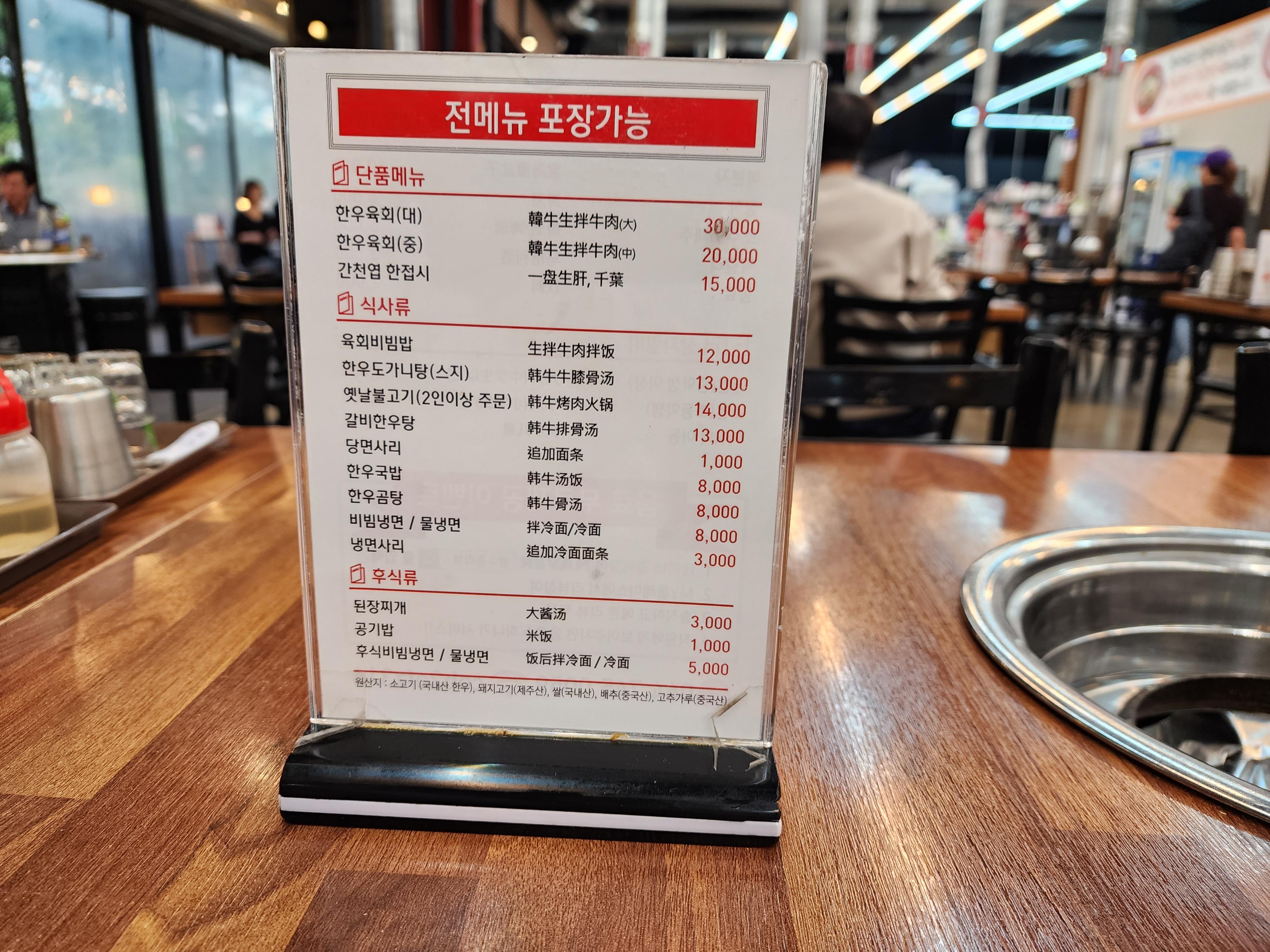 ▣ 메뉴; 한우육회(대) 3만원, 한우육회(중) 2만원, 간천엽 한 접시 15천원, 식사류; 육회비빔밥 12천원, 한우 도가니탕 13천원, 옛날불고기(2인이상) 14천원, 갈비한우탕 13천원, 냉면 8천원, 된장찌개 3천원/ 상차림비 대인(중학생이상) 4천원, 소인(초등학생) 3천원, 미취학아동 무료